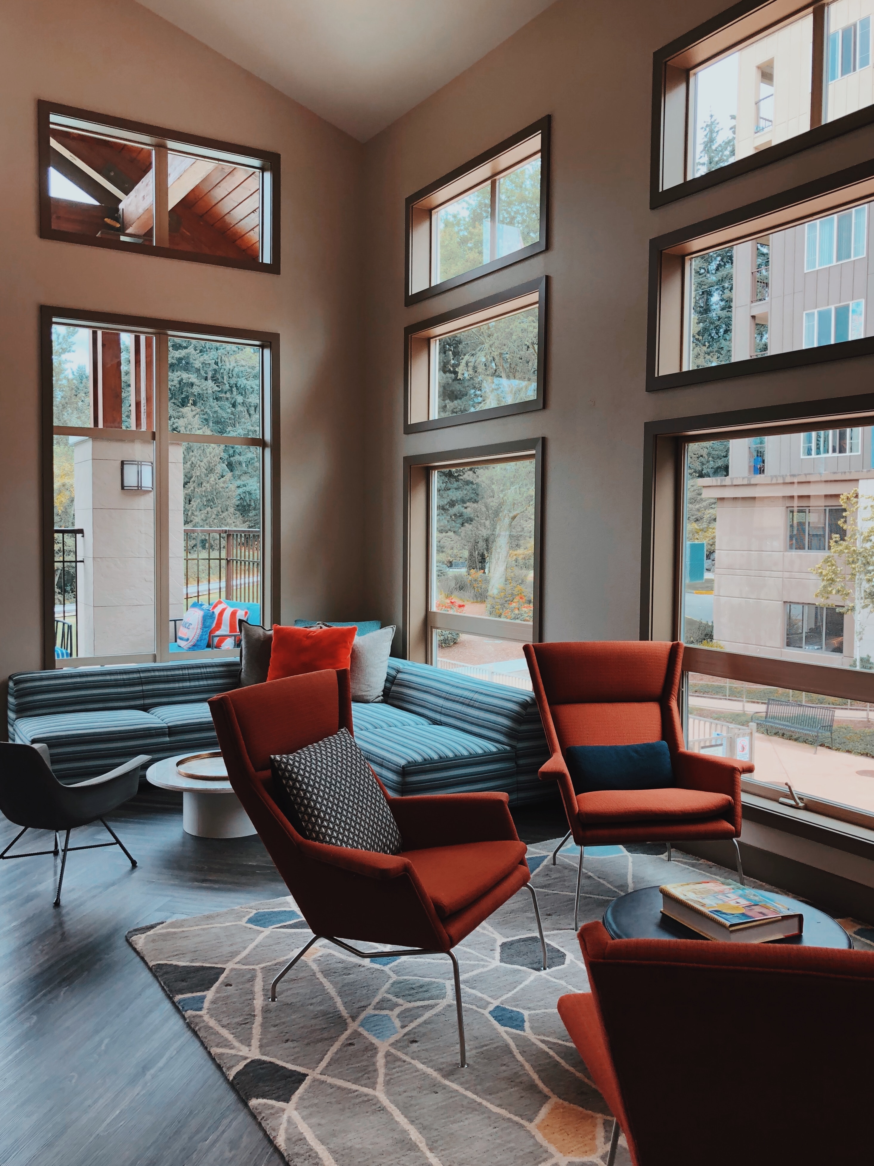 - A blue-gray rug infuses the space with proven stress-reducing elements.