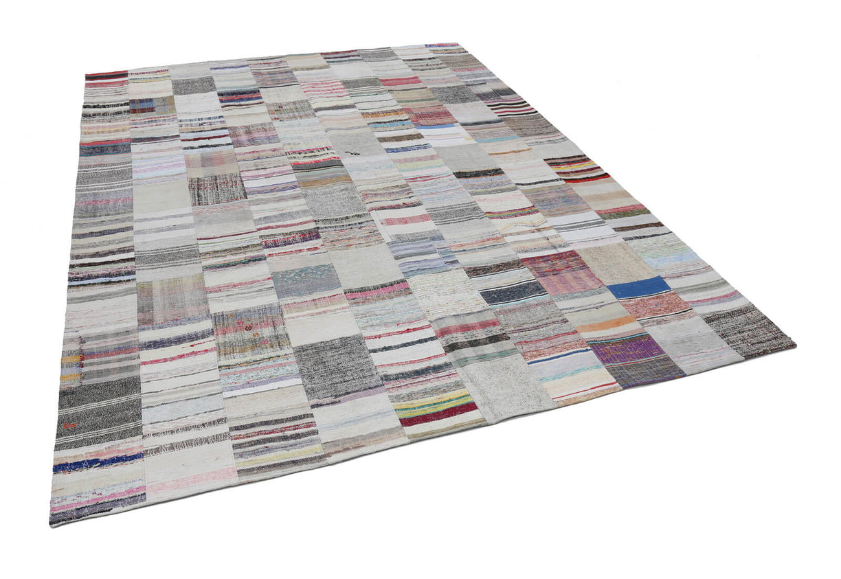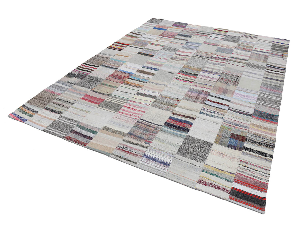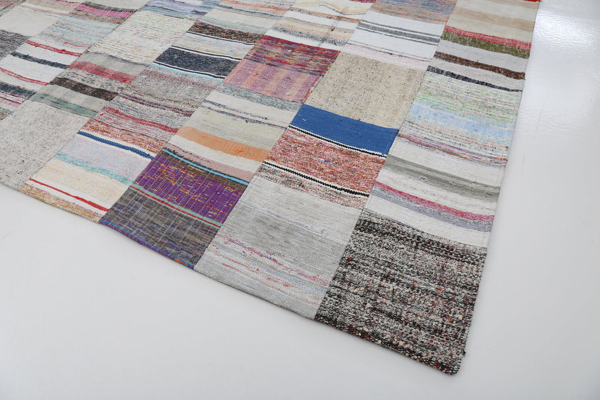 Colorful patchwork rug crafted from vintage Turkish 'chaput' fragments, also known as rag rugs. These unique Turkish chaput kilims are flatweaves handmade from recycled cotton, wool, and goat hair fabrics. Originally woven on narrow looms, chaput panels were later sewn together to create two or even three-winged reversible rugs. Chaput weaving, a traditional practice in Asia Minor, creatively reuses old textiles, forming eco-friendly, one-of-a-kind pieces with rich color and texture. Historically used as runners, area rugs, or bed covers, each vintage chaput patchwork rug showcases an authentic palette, unredyed and rich in character.