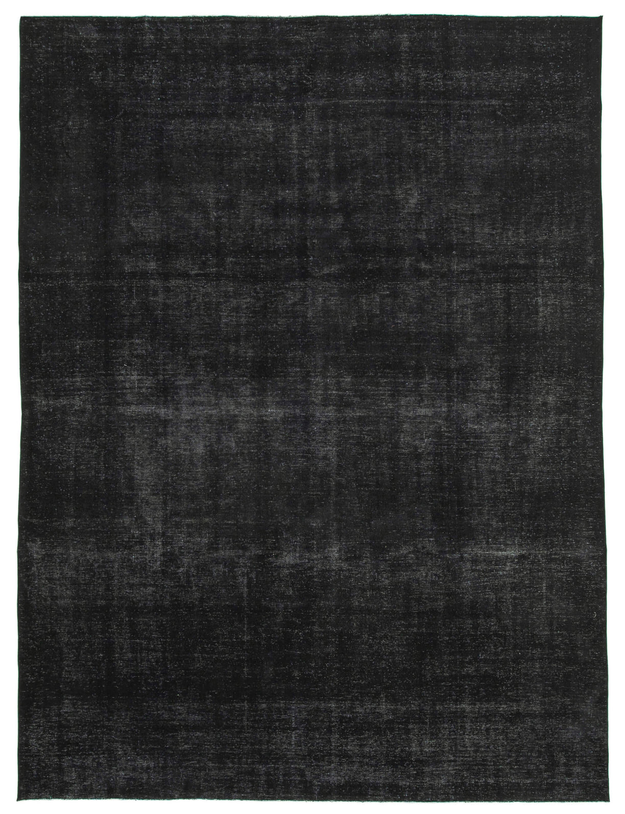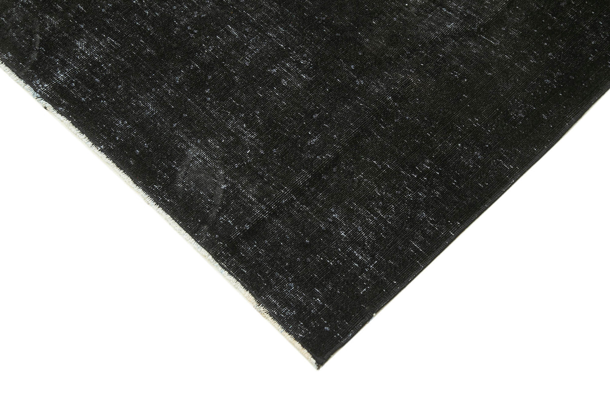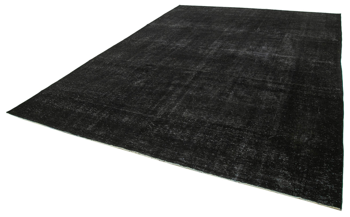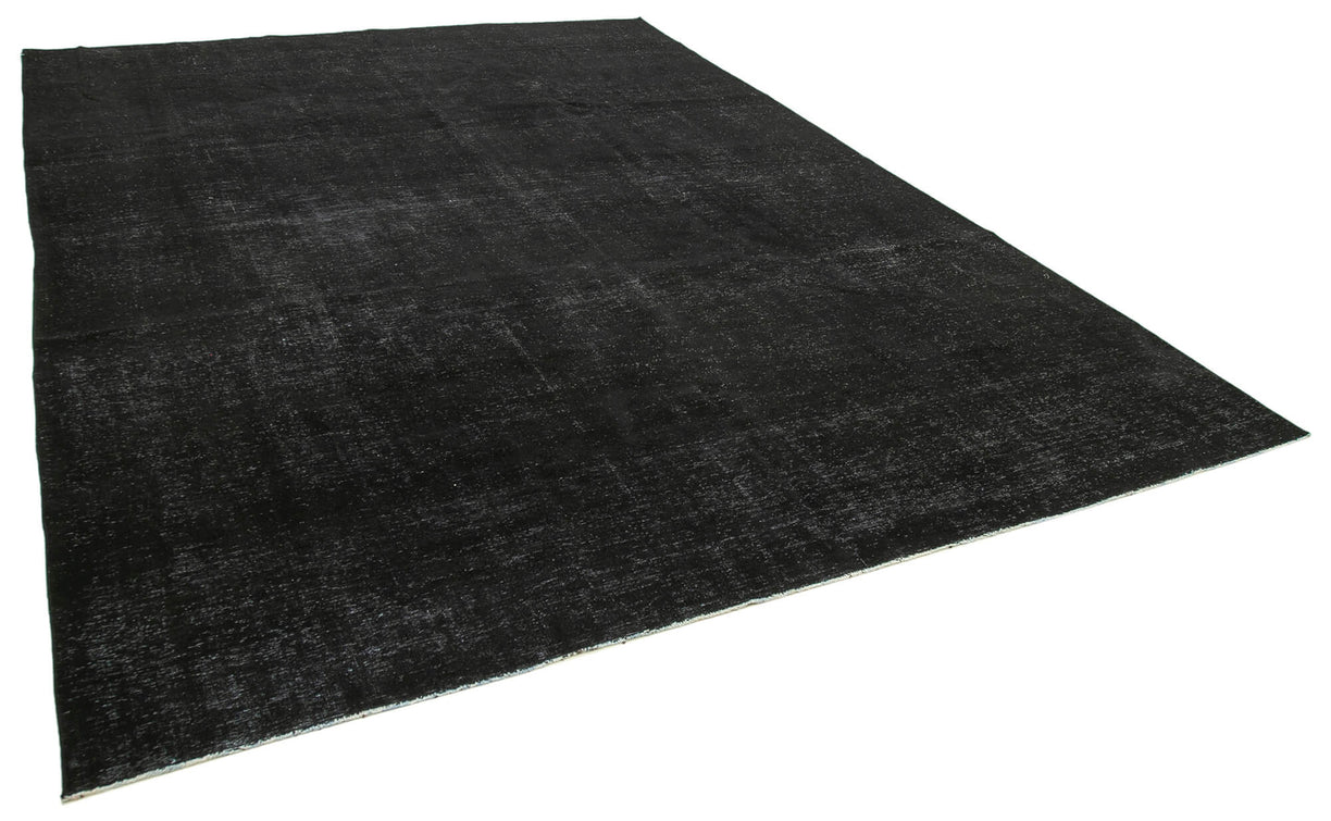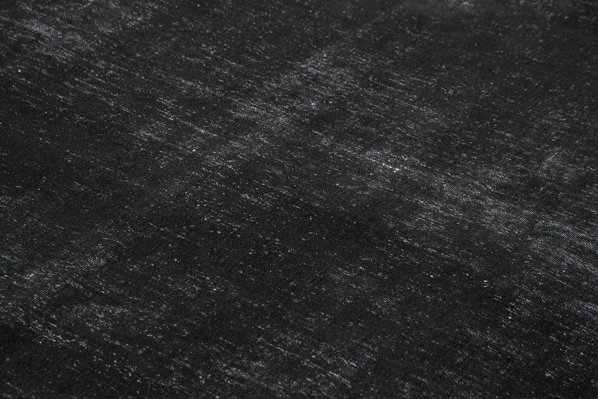 This black over-dyed rug offers a contemporary look with abstract appeal, crafted from a hand-knotted vintage Oriental rug from the 1960s. it measures 9' 10'' x 13' 1''. The rug undergoes a unique process to lower the pile, desaturate the color, and achieve the perfect hue. This transformation bridges generations of artisanal skill, making it a unique statement piece for modern décor. All our vintage rugs are professionally cleaned before being added to our collection.