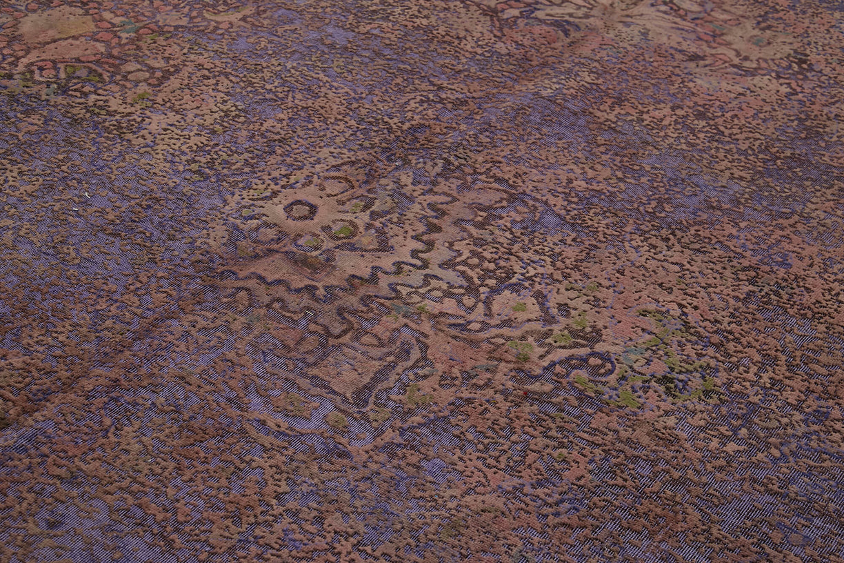 This purple over-dyed rug offers a contemporary look with abstract appeal, crafted from a hand-knotted vintage Oriental rug from the 1960s. it measures 9' 10'' x 12' 10''. The rug undergoes a unique process to lower the pile, desaturate the color, and achieve the perfect hue. This transformation bridges generations of artisanal skill, making it a unique statement piece for modern décor. All our vintage rugs are professionally cleaned before being added to our collection.