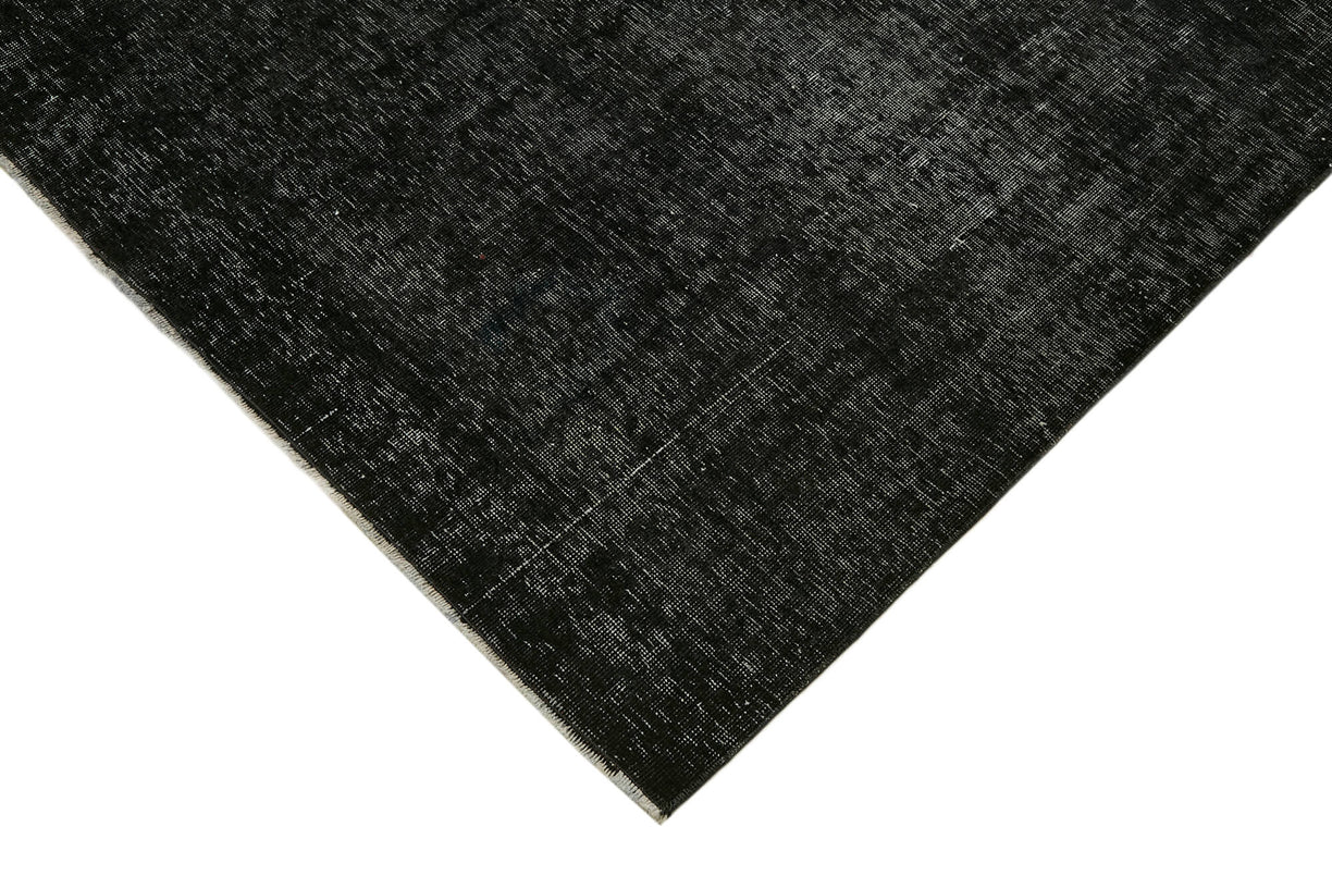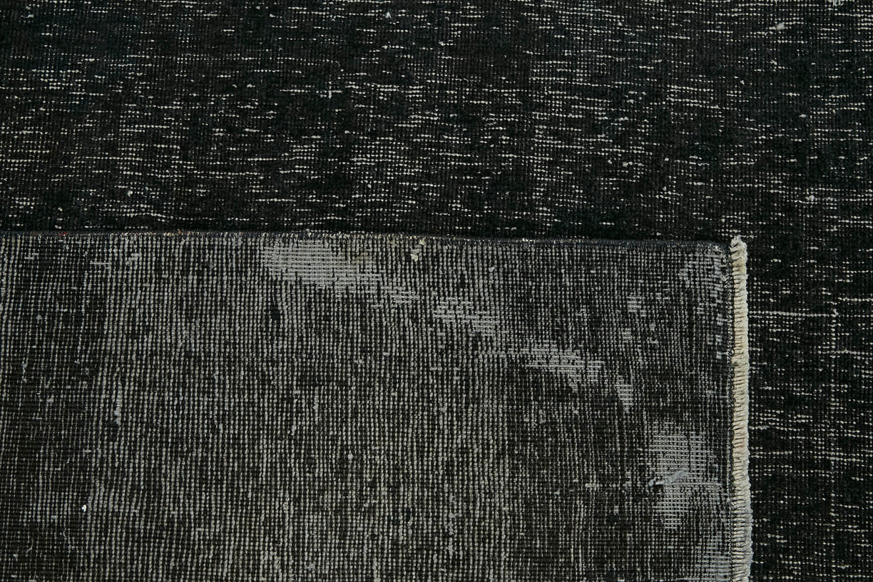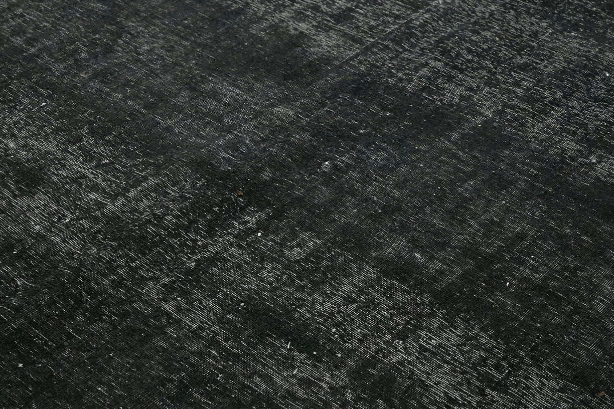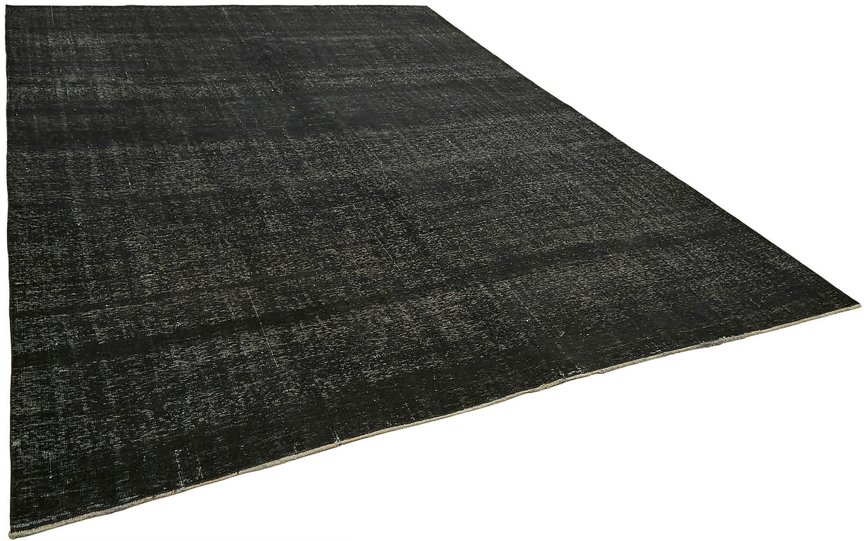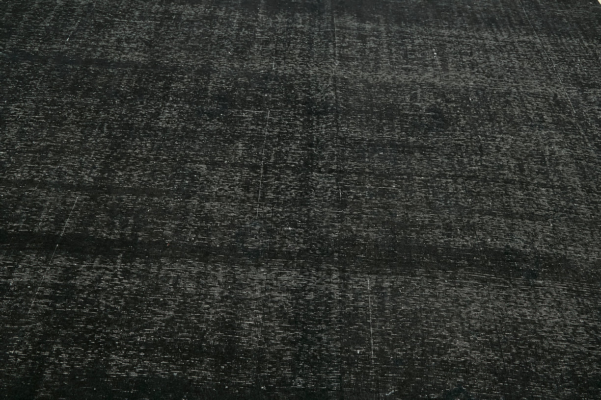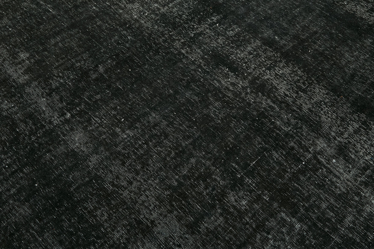 This black over-dyed rug offers a contemporary look with abstract appeal, crafted from a hand-knotted vintage Oriental rug from the 1960s. it measures 9' 8'' x 13' 0''. The rug undergoes a unique process to lower the pile, desaturate the color, and achieve the perfect hue. This transformation bridges generations of artisanal skill, making it a unique statement piece for modern décor. All our vintage rugs are professionally cleaned before being added to our collection.