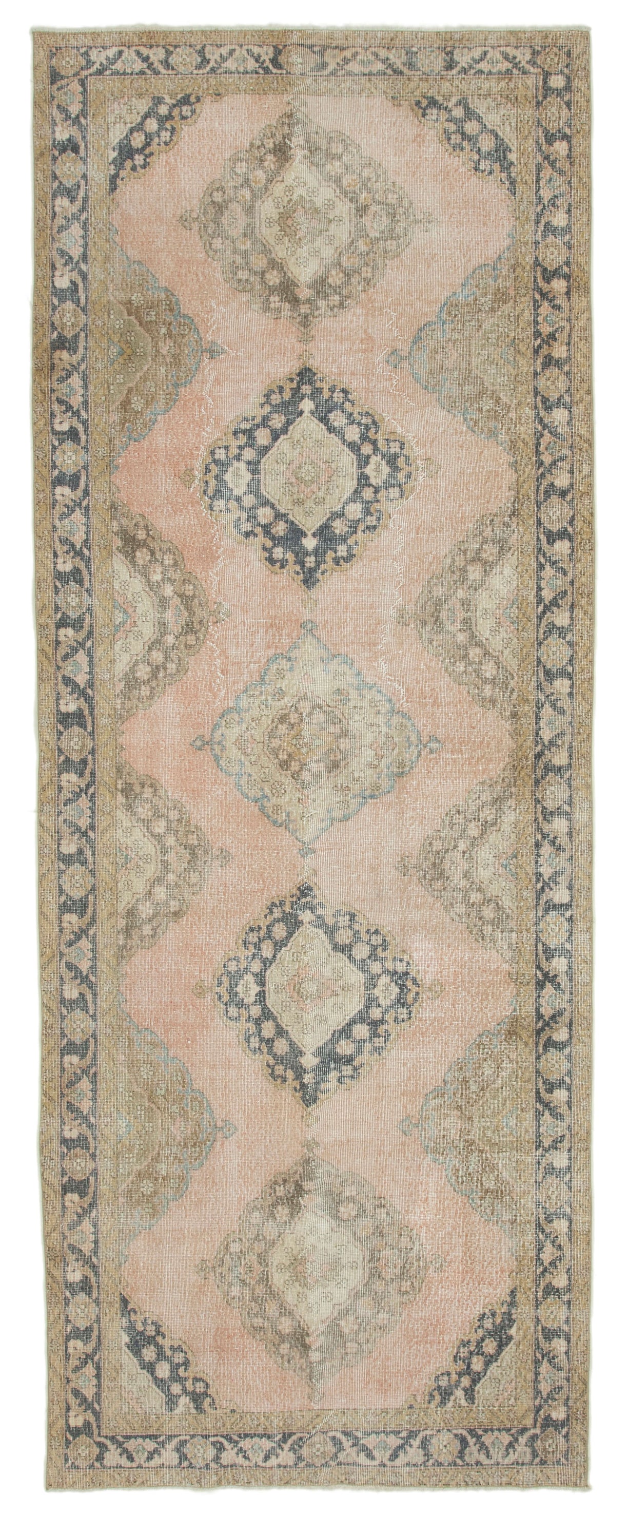 Beige Vintage Runners combine traditional and modern styles. Skilled artisans make them from 40 to 60-year-old hand-knotted Turkish carpets, carefully selected for their quality. The production process involves thorough cleaning and preserving of the original patterns.