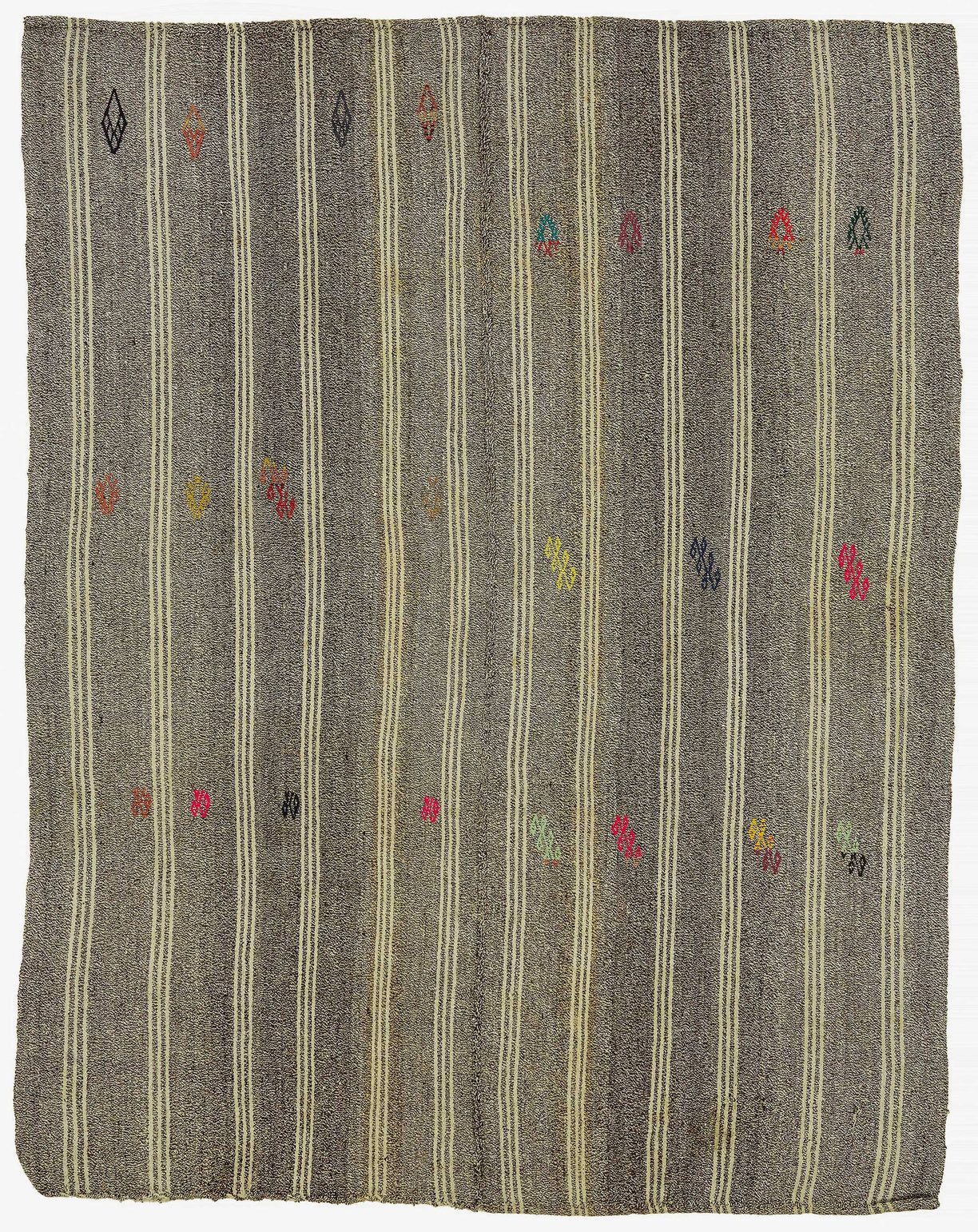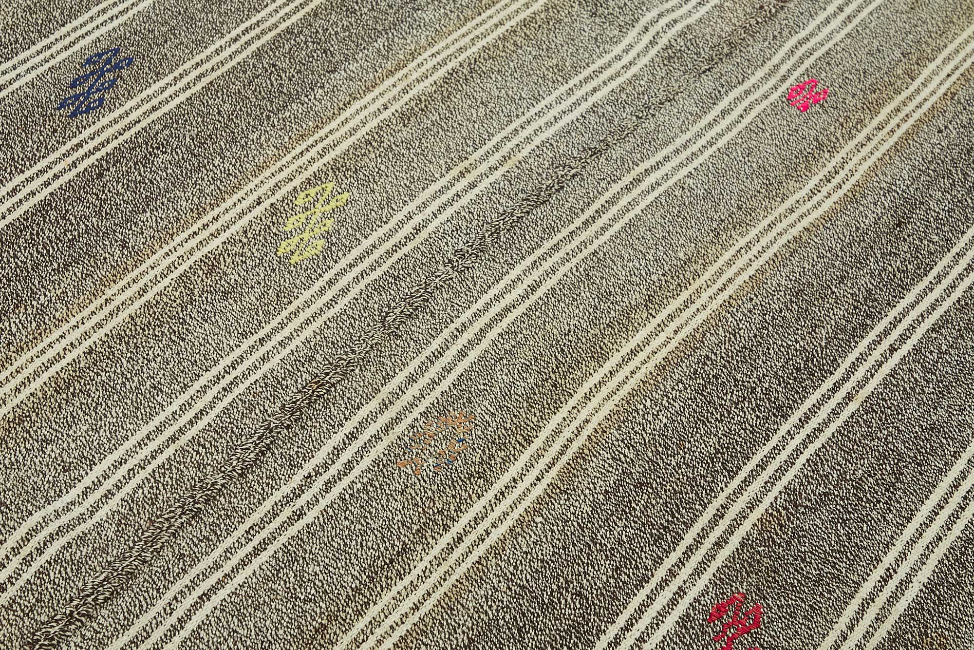 This handwoven kilim is crafted from a unique blend of goat hair and wool, a time-honored material combination used by Anatolian tribes for centuries. Known for its stiff, coarse texture, goat hair was traditionally used to make tents, saddle bags, and floor coverings due to its incredible durability and weather resistance.These vintage kilims, usually 40–60 years old, are perfect for high-traffic areas such as hallways, entryways, and office floors. The strong fiber structure allows the rug to lie flat and maintain its form over time.