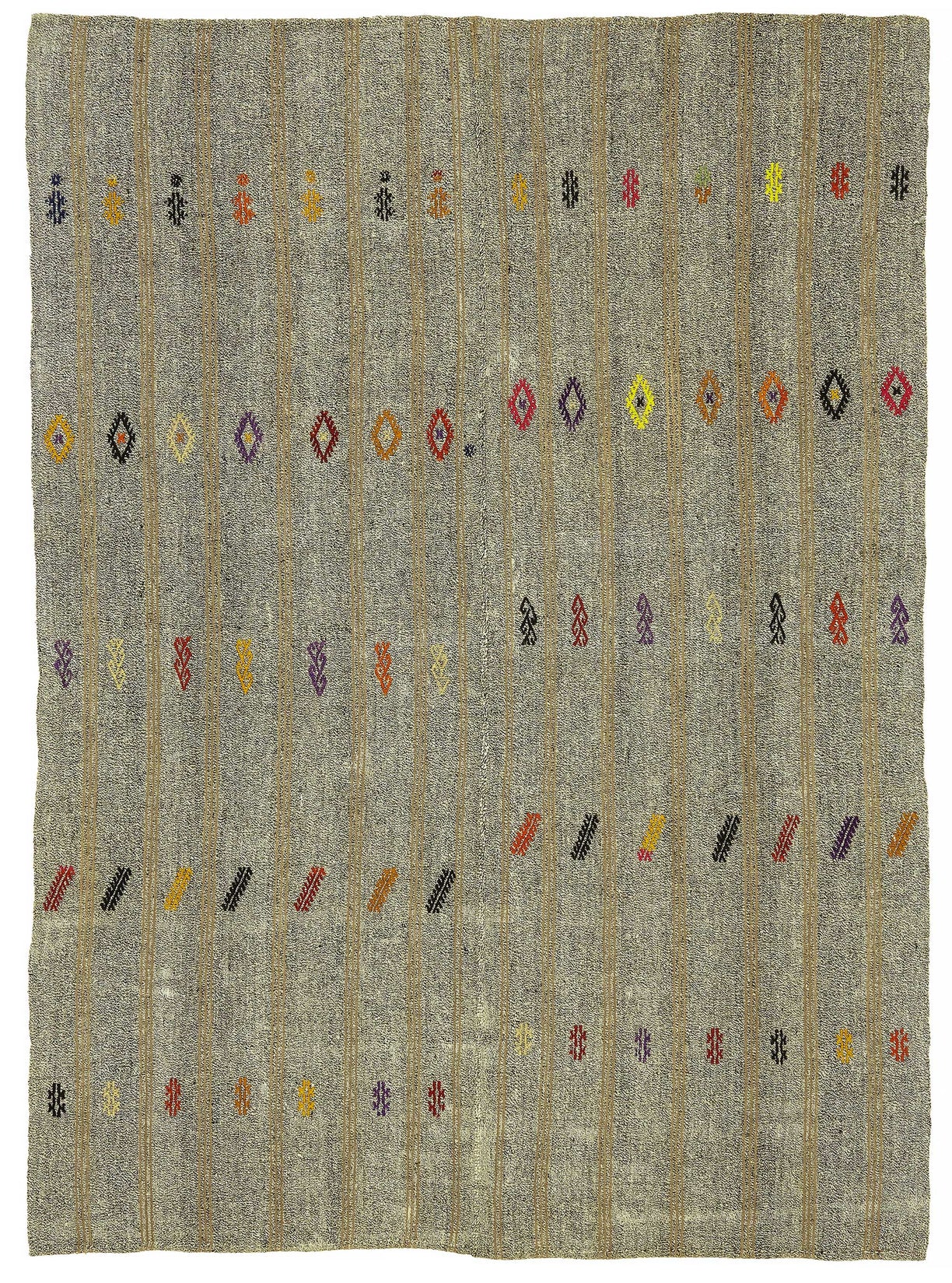 This handwoven kilim is crafted from a unique blend of goat hair and wool, a time-honored material combination used by Anatolian tribes for centuries. Known for its stiff, coarse texture, goat hair was traditionally used to make tents, saddle bags, and floor coverings due to its incredible durability and weather resistance.These vintage kilims, usually 40–60 years old, are perfect for high-traffic areas such as hallways, entryways, and office floors. The strong fiber structure allows the rug to lie flat and maintain its form over time.