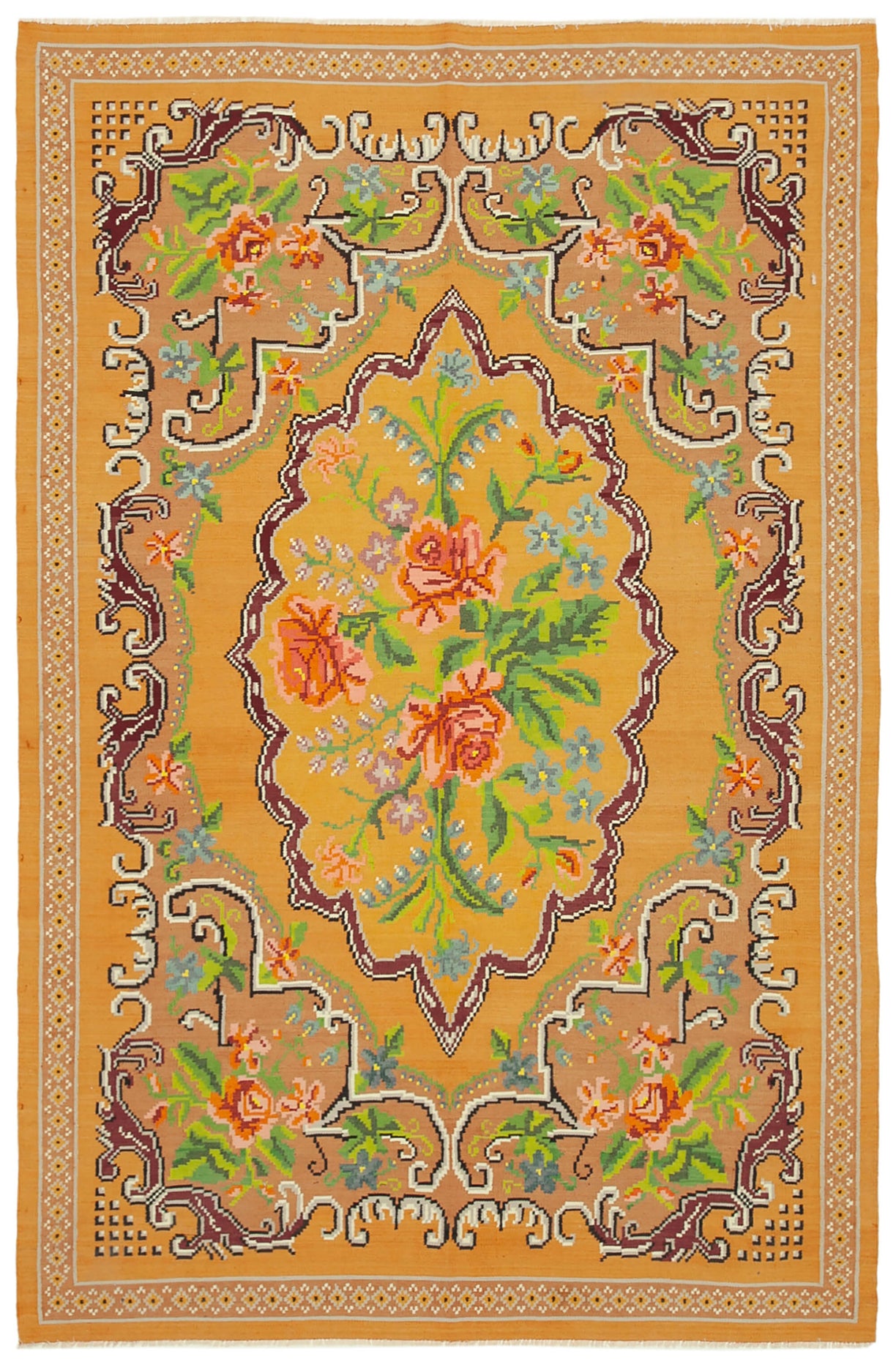 Authentic Handwoven Moldovan Kilim Rug, woven by hand in the 70s, showcasing a beautiful floral motif and timeless design. In superb condition, it’s an ideal addition to both modern and eclectic decor. To protect and preserve, consider using a rug pad.
