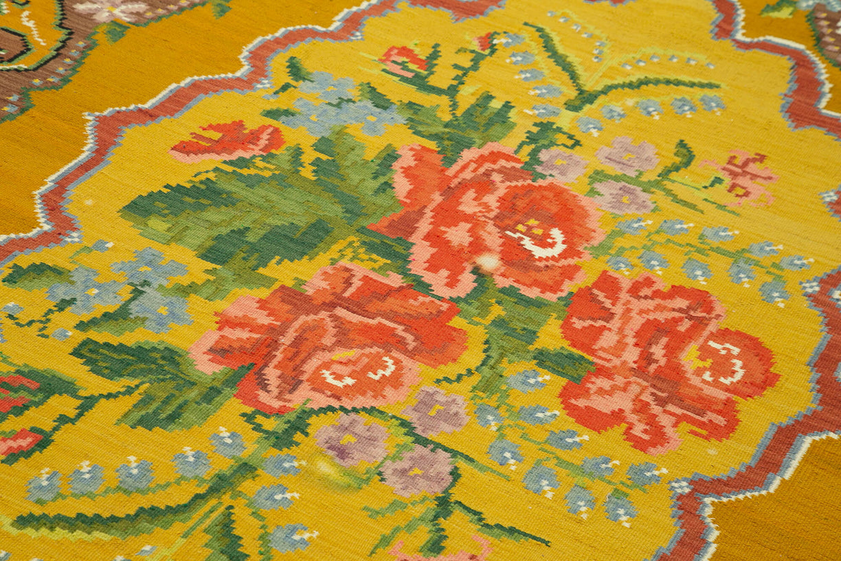 Authentic flat weave area rugs, woven by hand in the 70s, showcasing a beautiful floral motif and timeless design. In superb condition, it’s an ideal addition to both modern and eclectic decor. To protect and preserve, consider using a rug pad.