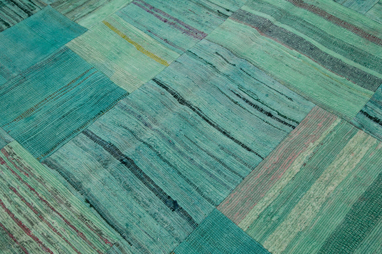 Colorful patchwork rug crafted from vintage Turkish 'chaput' fragments, also known as rag rugs. These unique Turkish chaput kilims are flatweaves handmade from recycled cotton, wool, and goat hair fabrics. Originally woven on narrow looms, chaput panels were later sewn together to create two or even three-winged reversible rugs. Chaput weaving, a traditional practice in Asia Minor, creatively reuses old textiles, forming eco-friendly, one-of-a-kind pieces with rich color and texture. Historically used as runners, area rugs, or bed covers, each vintage chaput patchwork rug showcases an authentic palette, unredyed and rich in character.