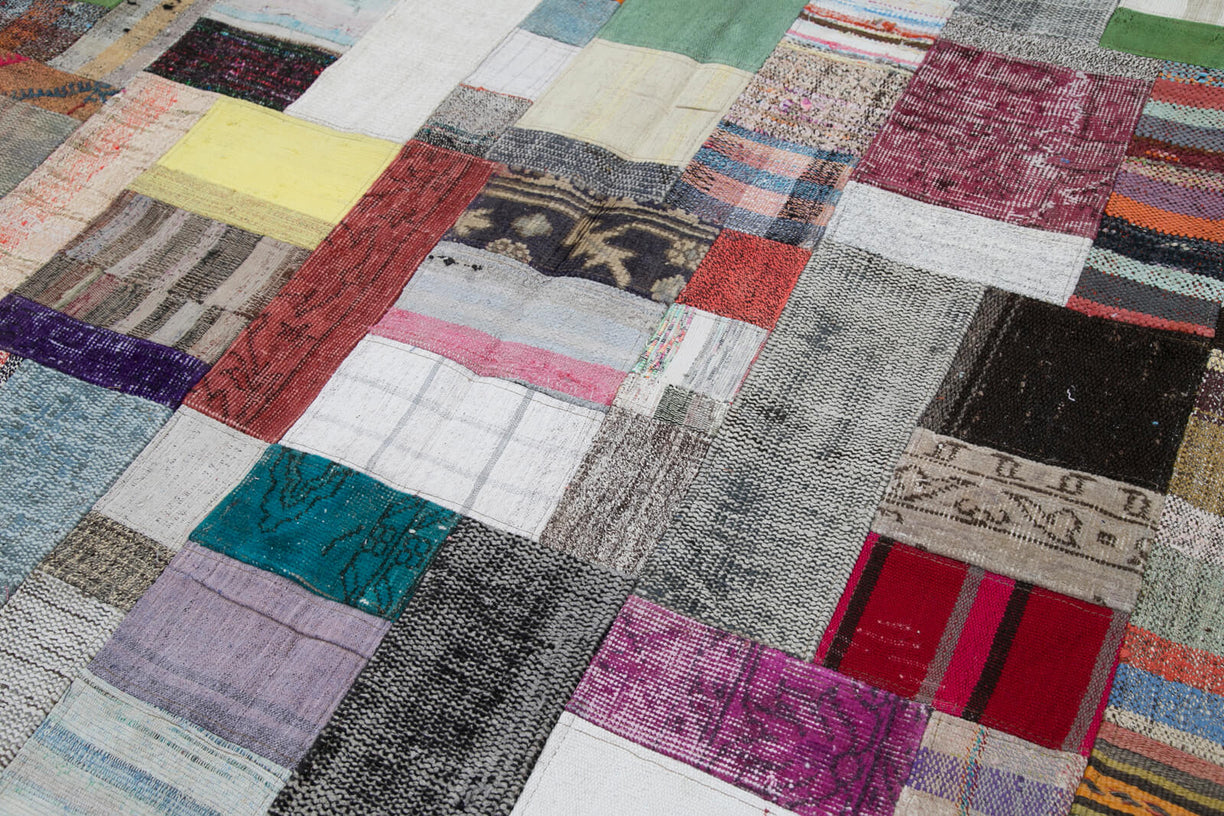 Colorful patchwork rug crafted from vintage Turkish 'chaput' fragments, also known as rag rugs. These unique Turkish chaput kilims are flatweaves handmade from recycled cotton, wool, and goat hair fabrics. Originally woven on narrow looms, chaput panels were later sewn together to create two or even three-winged reversible rugs. Chaput weaving, a traditional practice in Asia Minor, creatively reuses old textiles, forming eco-friendly, one-of-a-kind pieces with rich color and texture. Historically used as runners, area rugs, or bed covers, each vintage chaput patchwork rug showcases an authentic palette, unredyed and rich in character.