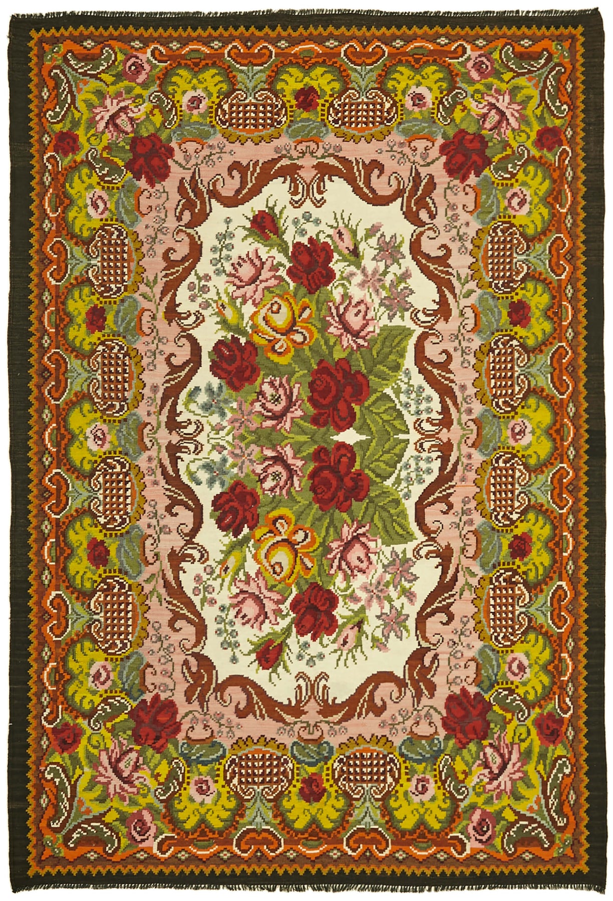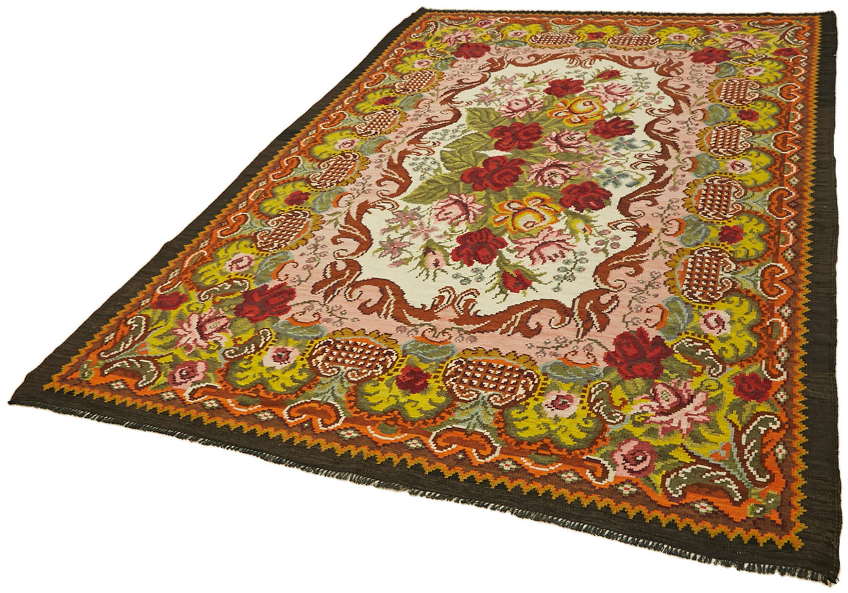 Elegant Moldovan Rose Kilim, hand-woven in the 70s, featuring a vibrant floral pattern and rich colors. This vintage rug is in excellent condition and perfect for adding a touch of bohemian or eclectic flair to any space. A rug pad is recommended for added comfort and durability.