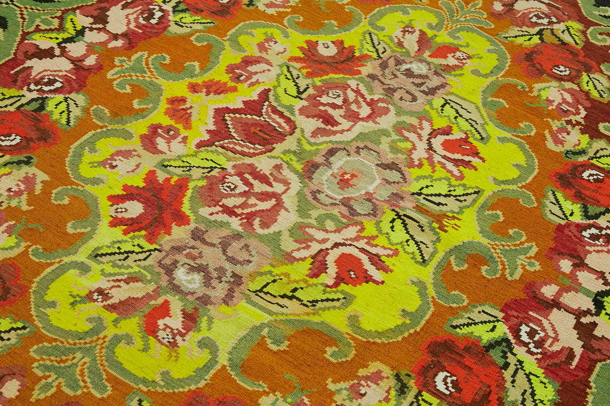 Charming Moldovan Rose Kilim from the 1970s, hand-crafted with intricate floral designs and a warm, inviting color scheme. This well-preserved vintage rug complements both bohemian and eclectic interiors. Enhance its longevity with a rug pad.