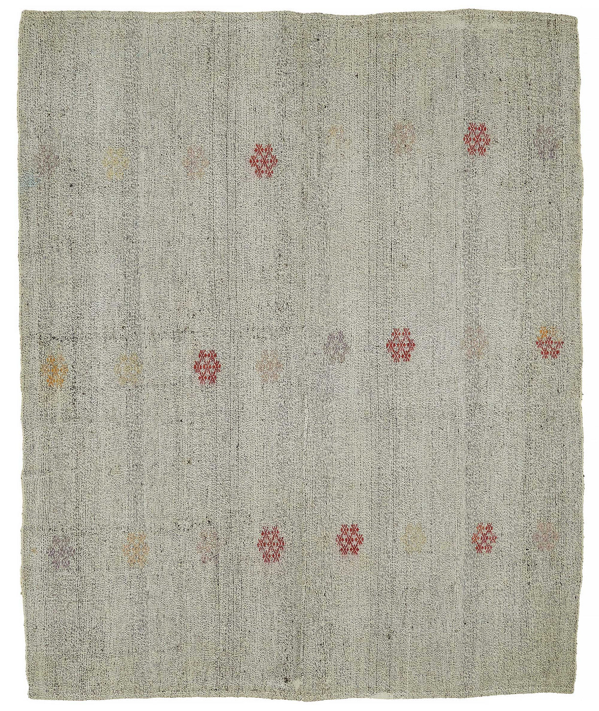This handwoven kilim is crafted from a unique blend of goat hair and wool, a time-honored material combination used by Anatolian tribes for centuries. Known for its stiff, coarse texture, goat hair was traditionally used to make tents, saddle bags, and floor coverings due to its incredible durability and weather resistance.These vintage kilims, usually 40–60 years old, are perfect for high-traffic areas such as hallways, entryways, and office floors. The strong fiber structure allows the rug to lie flat and maintain its form over time.