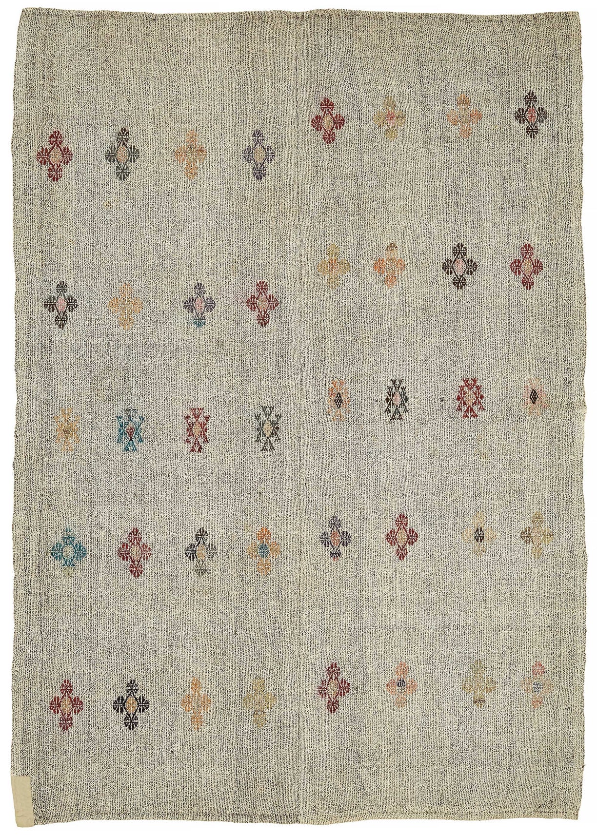 This handwoven kilim is crafted from a unique blend of goat hair and wool, a time-honored material combination used by Anatolian tribes for centuries. Known for its stiff, coarse texture, goat hair was traditionally used to make tents, saddle bags, and floor coverings due to its incredible durability and weather resistance.These vintage kilims, usually 40–60 years old, are perfect for high-traffic areas such as hallways, entryways, and office floors. The strong fiber structure allows the rug to lie flat and maintain its form over time.