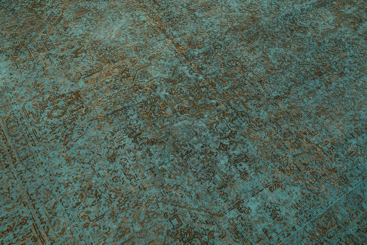 This turquoise over-dyed rug offers a contemporary look with abstract appeal, crafted from a hand-knotted vintage Oriental rug from the 1960s. it measures 7' 7'' x 10' 6''. The rug undergoes a unique process to lower the pile, desaturate the color, and achieve the perfect hue. This transformation bridges generations of artisanal skill, making it a unique statement piece for modern décor. All our vintage rugs are professionally cleaned before being added to our collection.
