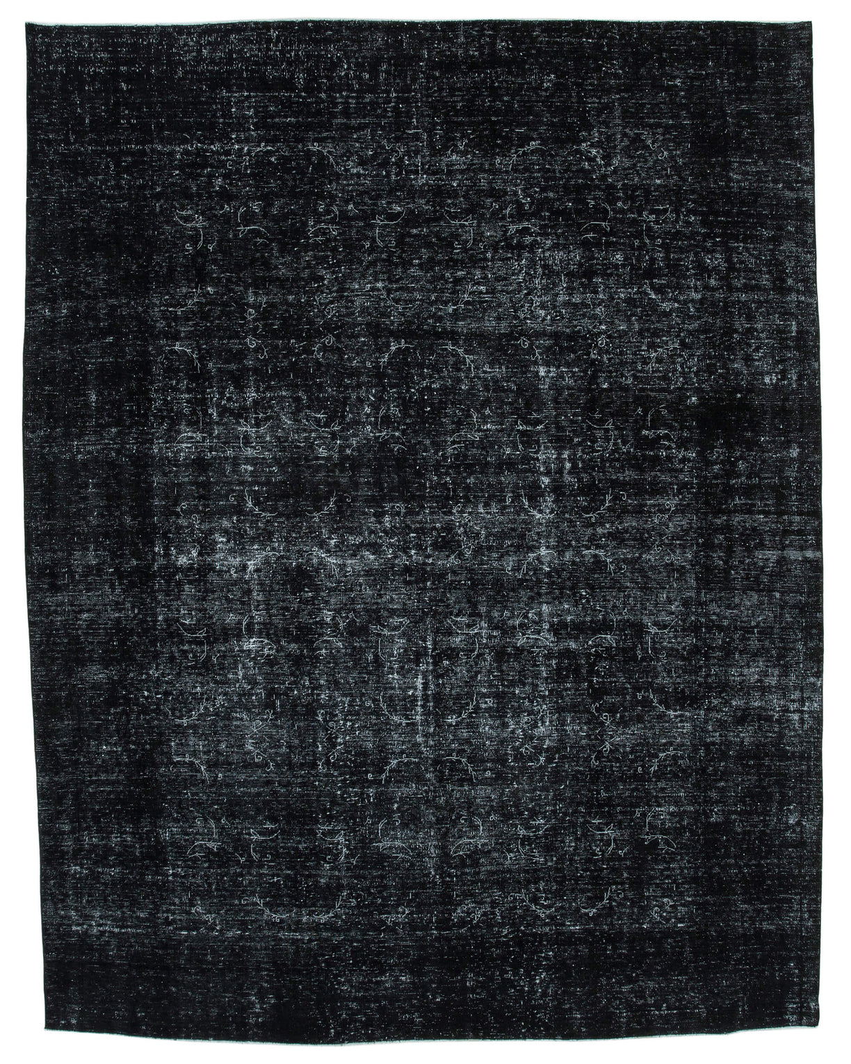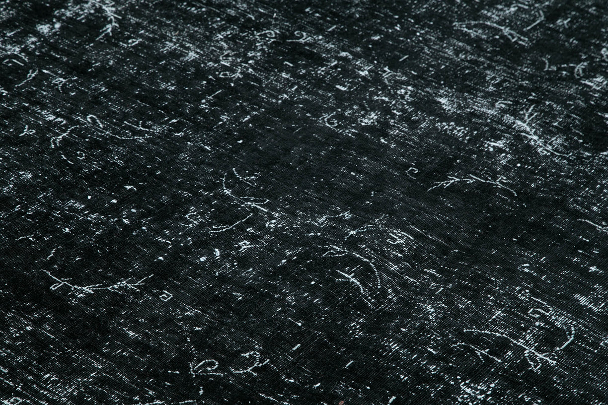 This black over-dyed rug offers a contemporary look with abstract appeal, crafted from a hand-knotted vintage Oriental rug from the 1960s. it measures 9' 4'' x 12' 1''. The rug undergoes a unique process to lower the pile, desaturate the color, and achieve the perfect hue. This transformation bridges generations of artisanal skill, making it a unique statement piece for modern décor. All our vintage rugs are professionally cleaned before being added to our collection.
