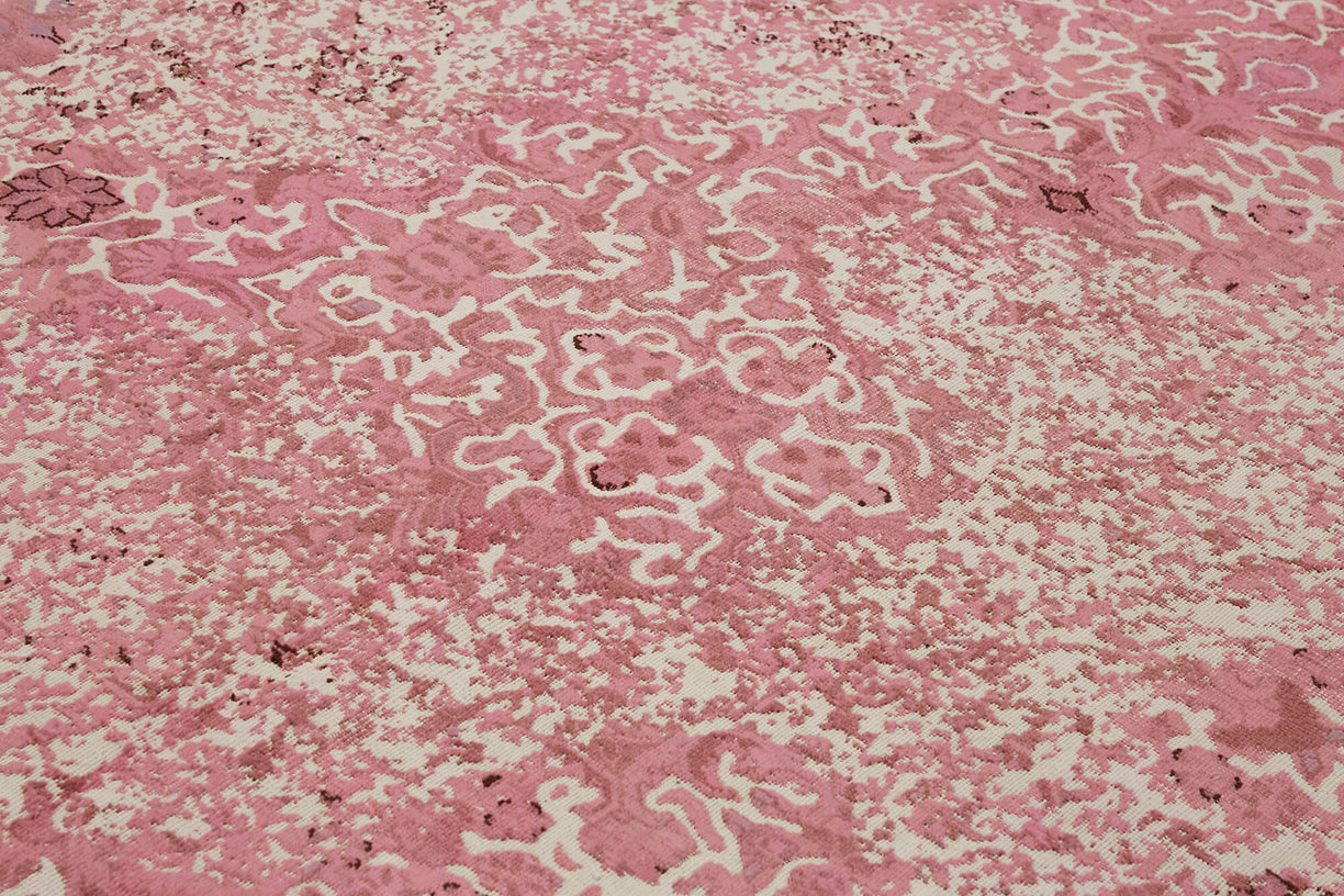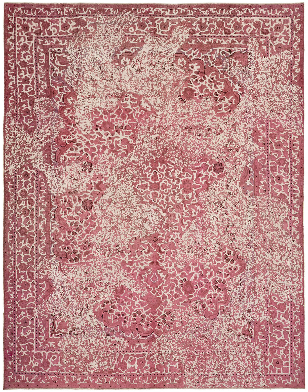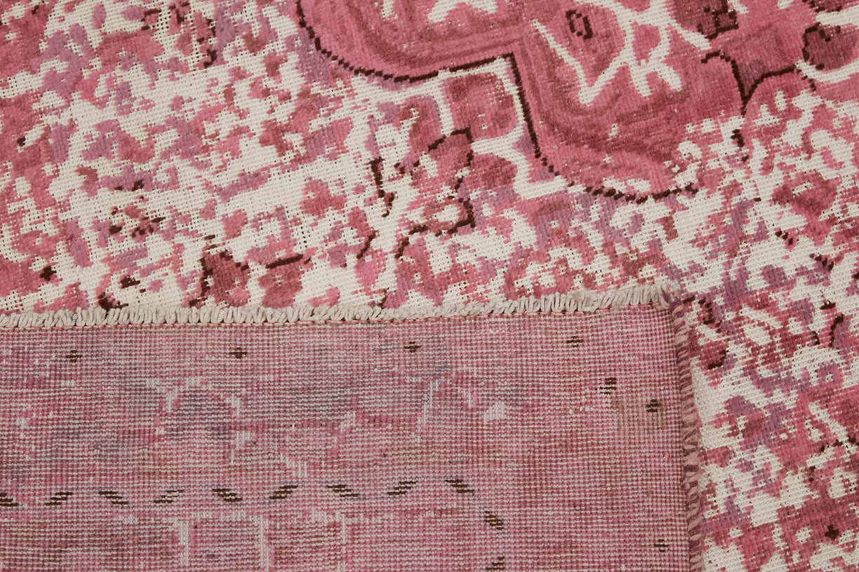 This pink over-dyed rug offers a contemporary look with abstract appeal, crafted from a hand-knotted vintage Oriental rug from the 1960s. it measures 9' 5'' x 11' 10''. The rug undergoes a unique process to lower the pile, desaturate the color, and achieve the perfect hue. This transformation bridges generations of artisanal skill, making it a unique statement piece for modern décor. All our vintage rugs are professionally cleaned before being added to our collection.