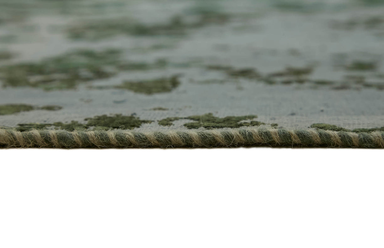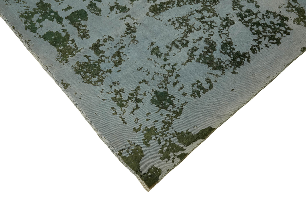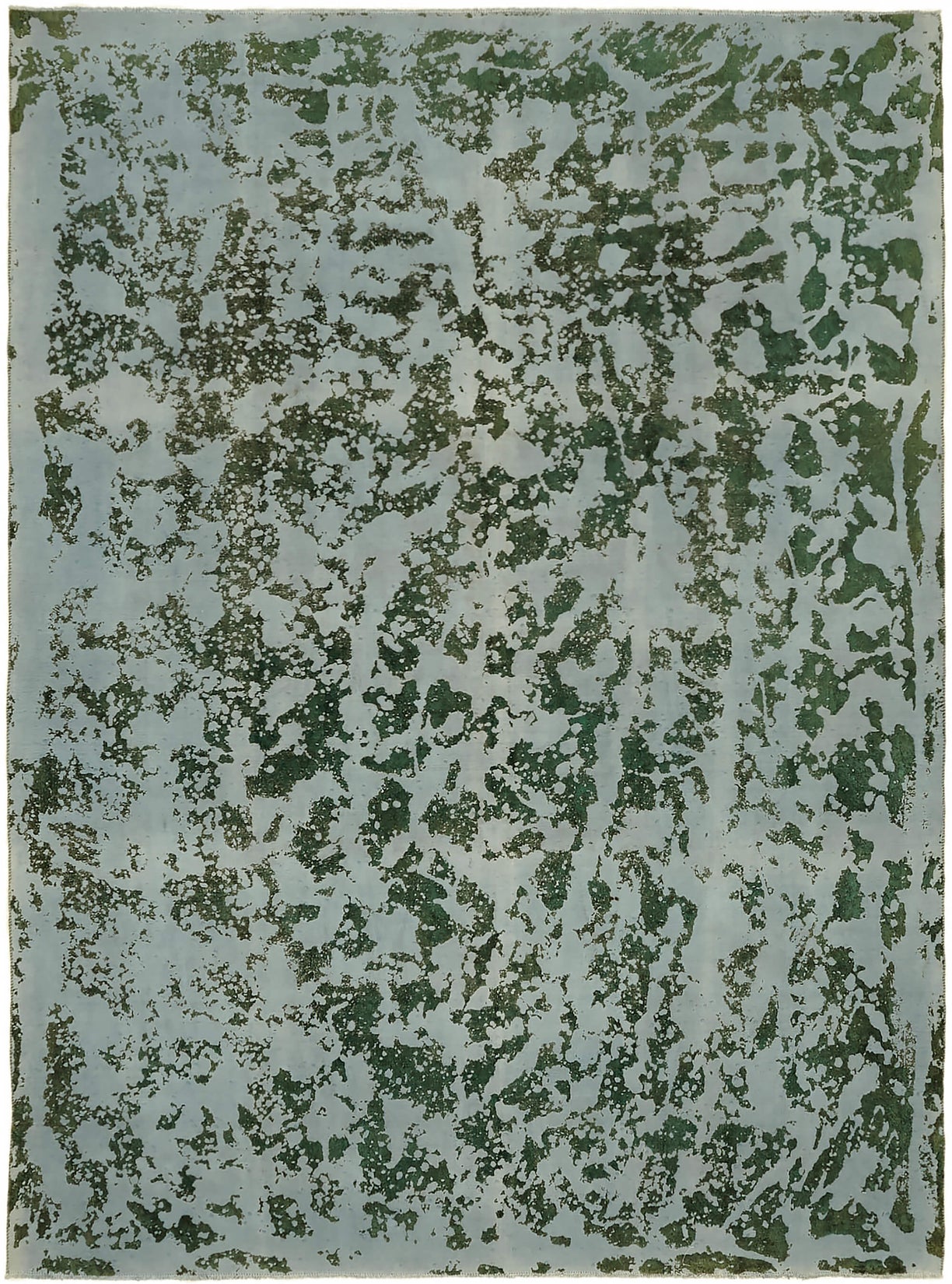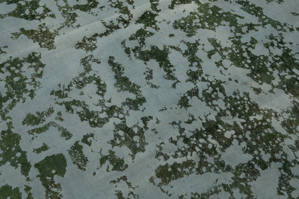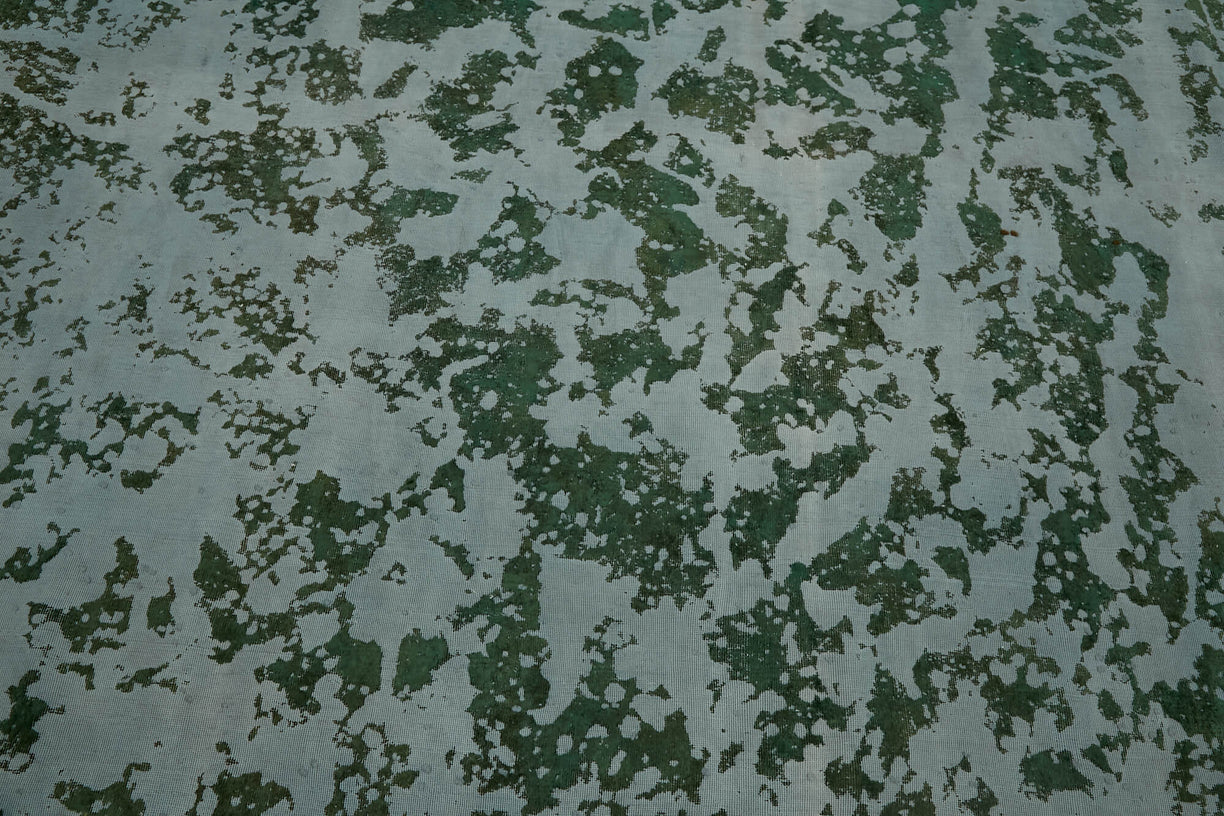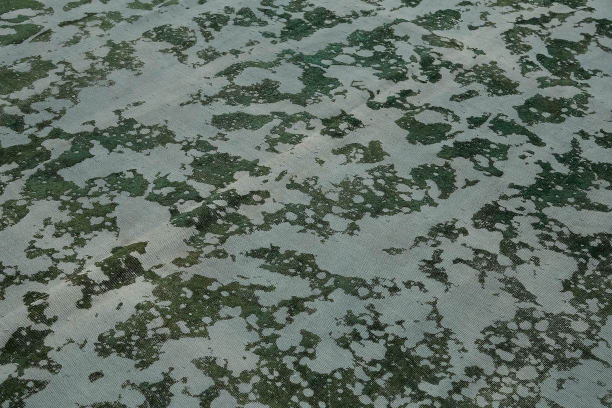 This green over-dyed rug offers a contemporary look with abstract appeal, crafted from a hand-knotted vintage Oriental rug from the 1960s. it measures 9' 2'' x 12' 5''. The rug undergoes a unique process to lower the pile, desaturate the color, and achieve the perfect hue. This transformation bridges generations of artisanal skill, making it a unique statement piece for modern décor. All our vintage rugs are professionally cleaned before being added to our collection.