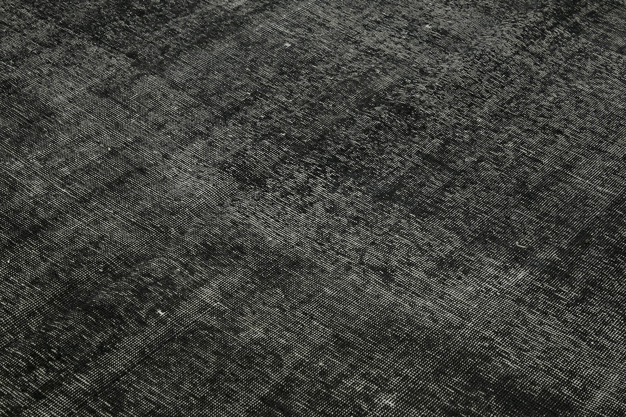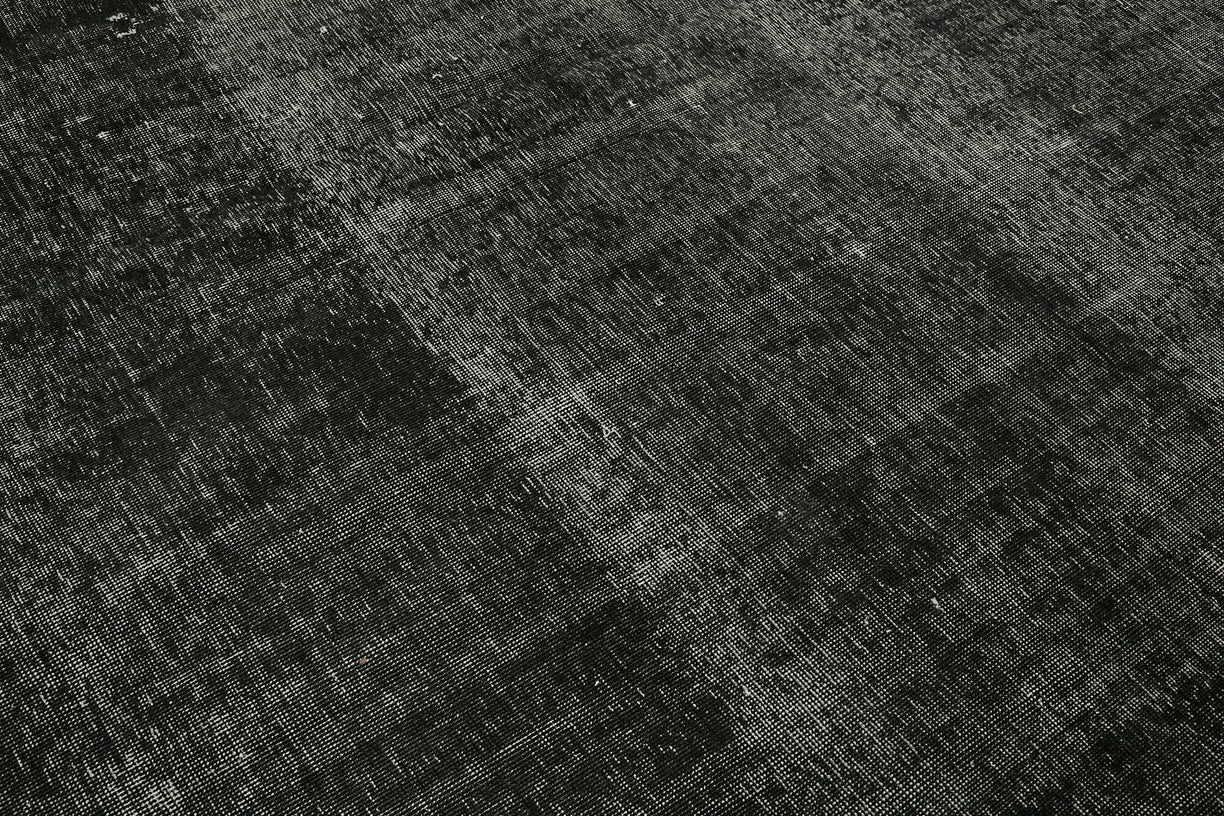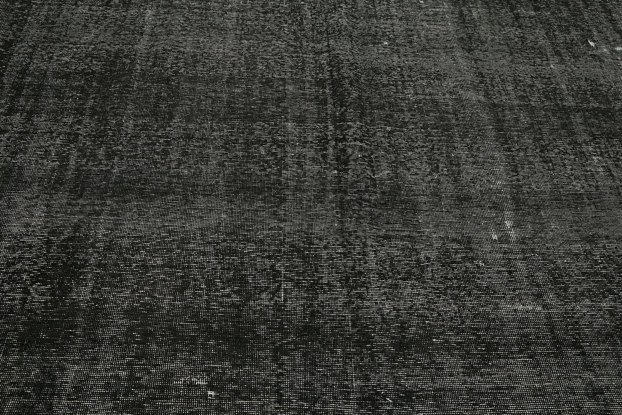 This black over-dyed rug offers a contemporary look with abstract appeal, crafted from a hand-knotted vintage Oriental rug from the 1960s. it measures 9' 5'' x 12' 0''. The rug undergoes a unique process to lower the pile, desaturate the color, and achieve the perfect hue. This transformation bridges generations of artisanal skill, making it a unique statement piece for modern décor. All our vintage rugs are professionally cleaned before being added to our collection.