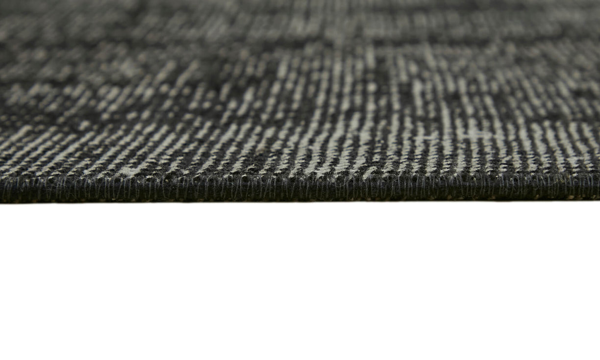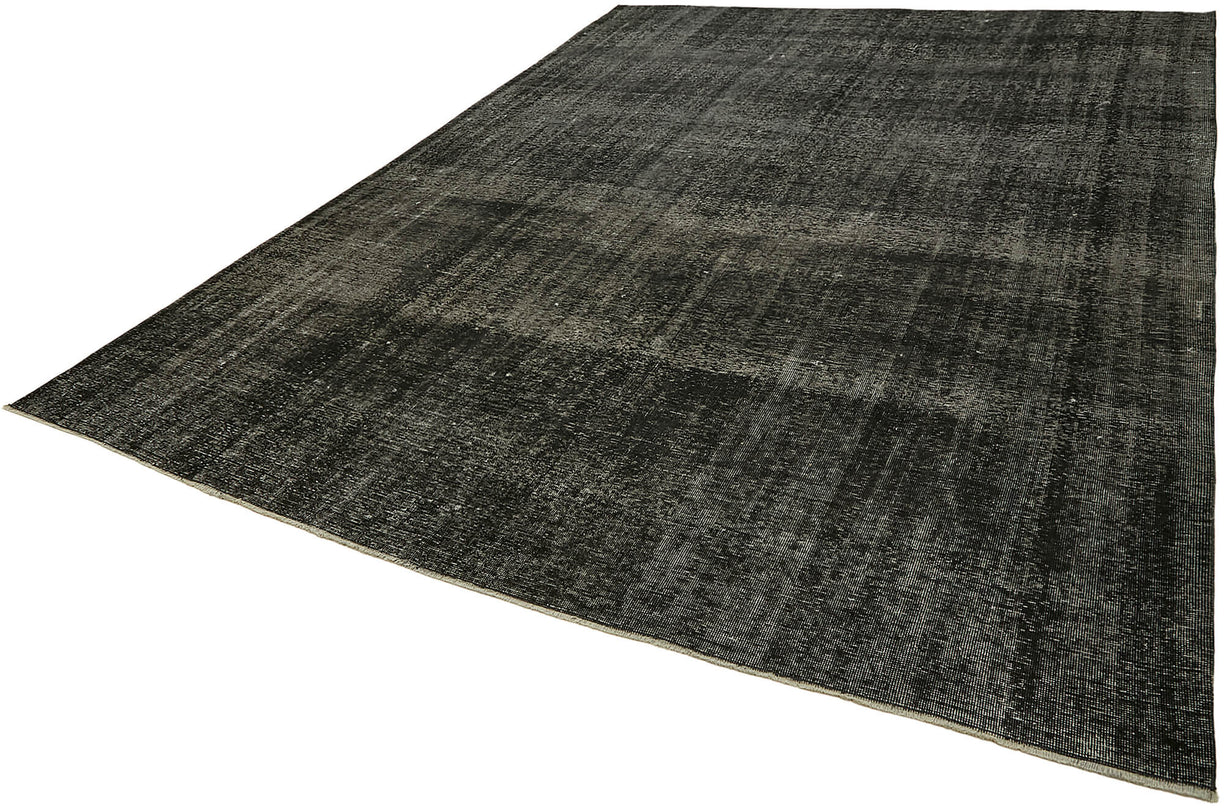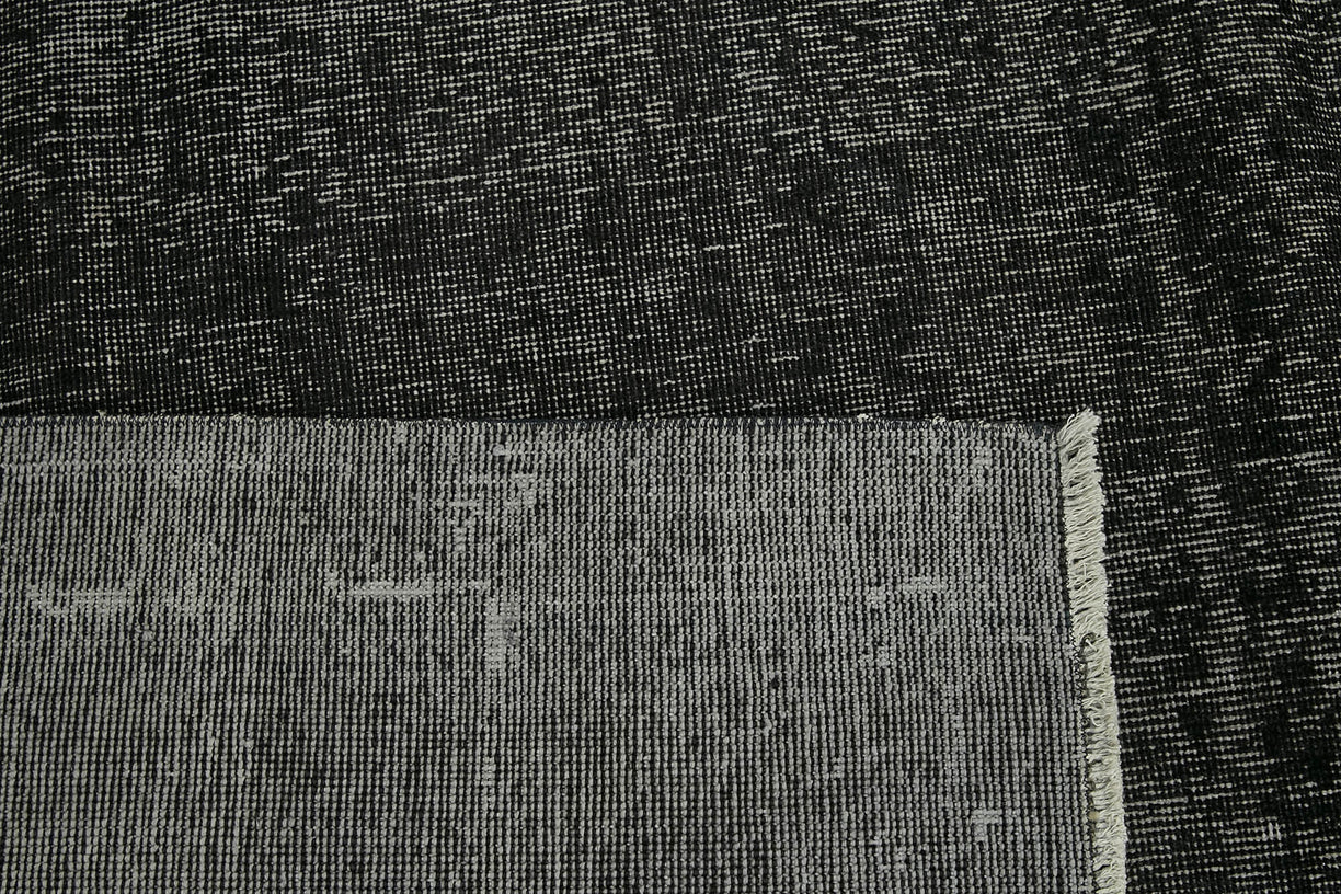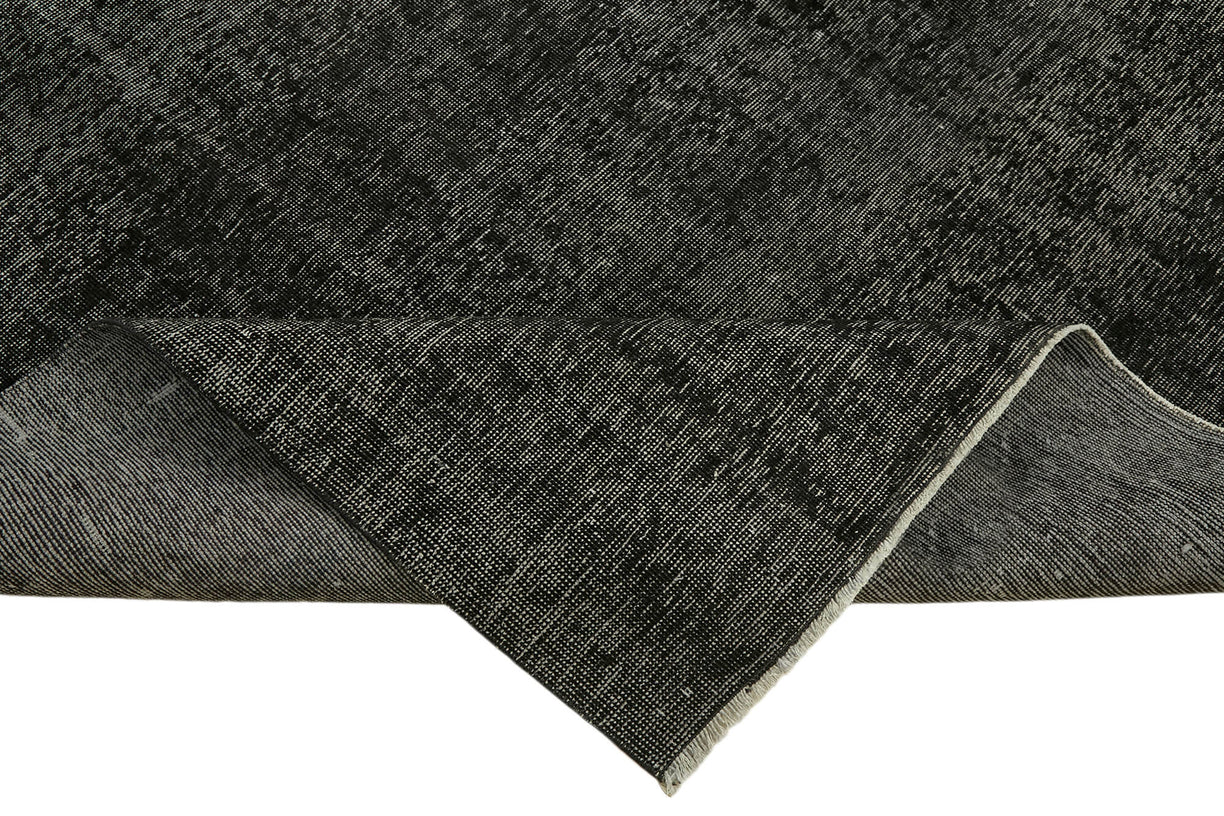 This black over-dyed rug offers a contemporary look with abstract appeal, crafted from a hand-knotted vintage Oriental rug from the 1960s. it measures 9' 5'' x 12' 0''. The rug undergoes a unique process to lower the pile, desaturate the color, and achieve the perfect hue. This transformation bridges generations of artisanal skill, making it a unique statement piece for modern décor. All our vintage rugs are professionally cleaned before being added to our collection.