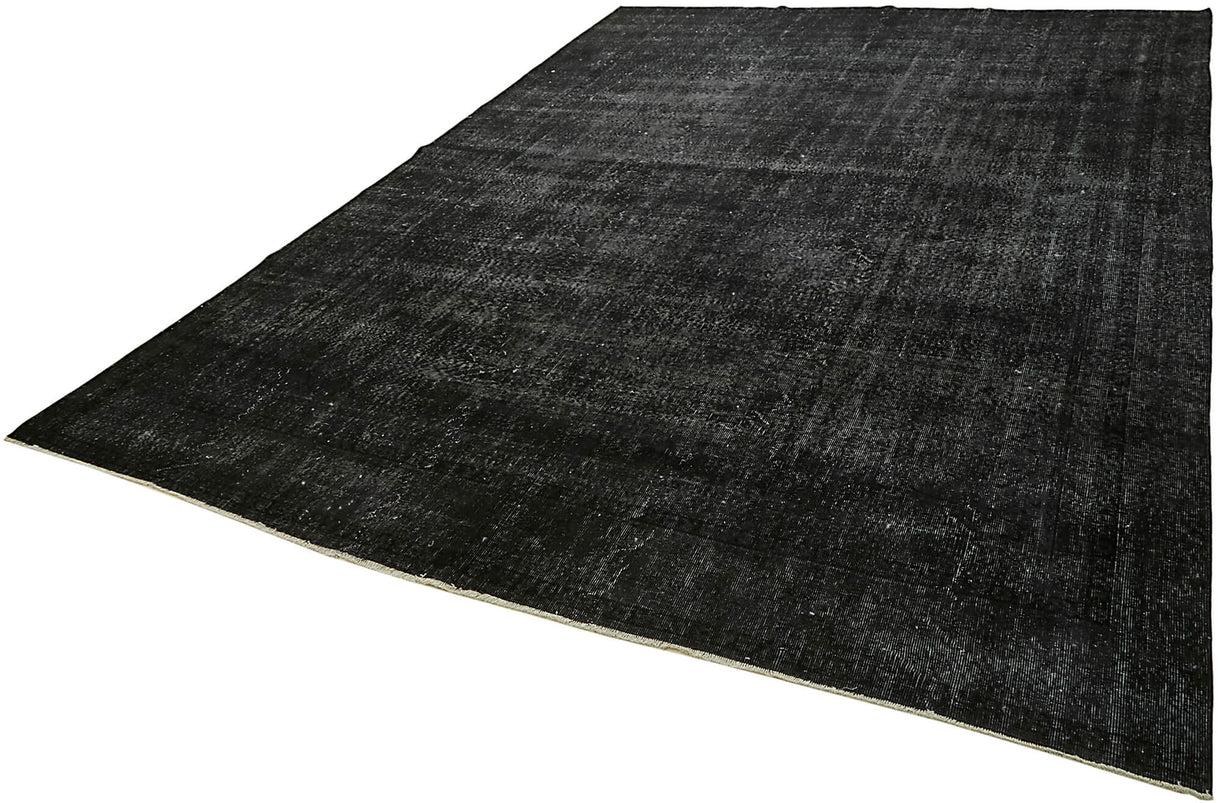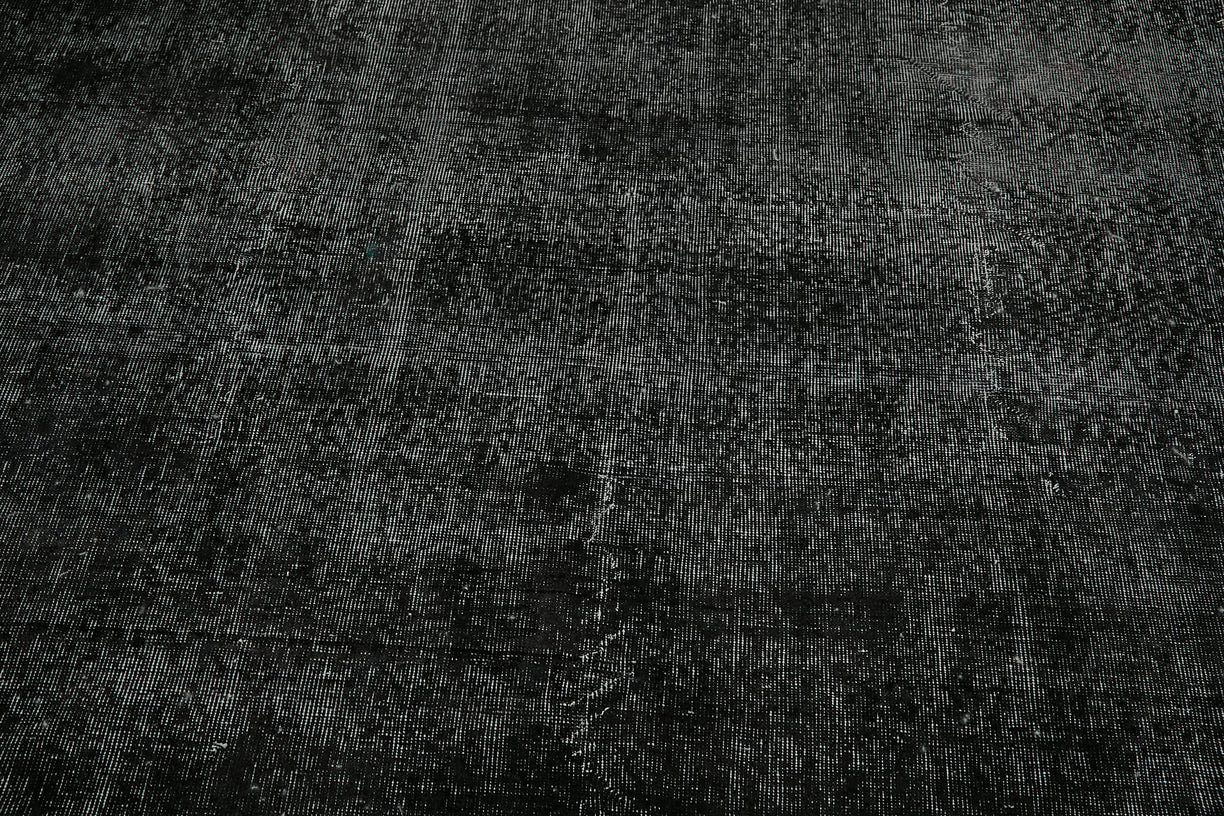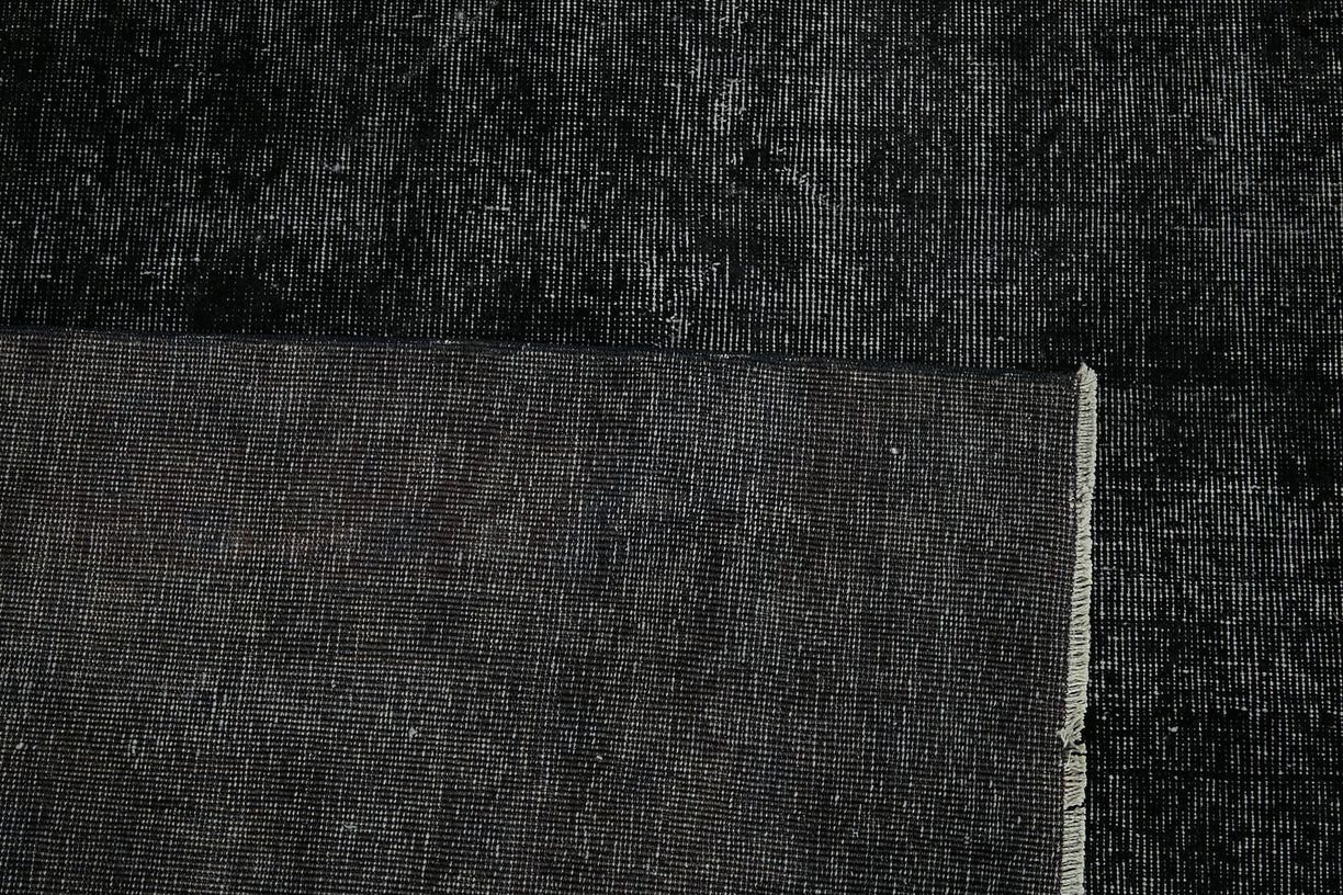 This black over-dyed rug offers a contemporary look with abstract appeal, crafted from a hand-knotted vintage Oriental rug from the 1960s. it measures 9' 0'' x 12' 1''. The rug undergoes a unique process to lower the pile, desaturate the color, and achieve the perfect hue. This transformation bridges generations of artisanal skill, making it a unique statement piece for modern décor. All our vintage rugs are professionally cleaned before being added to our collection.