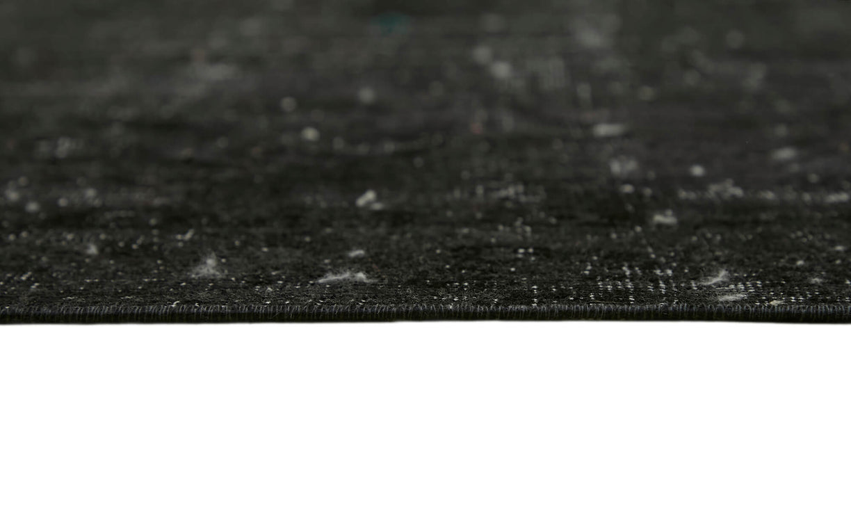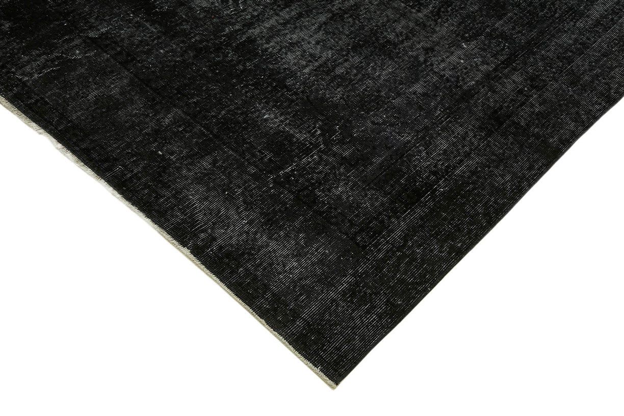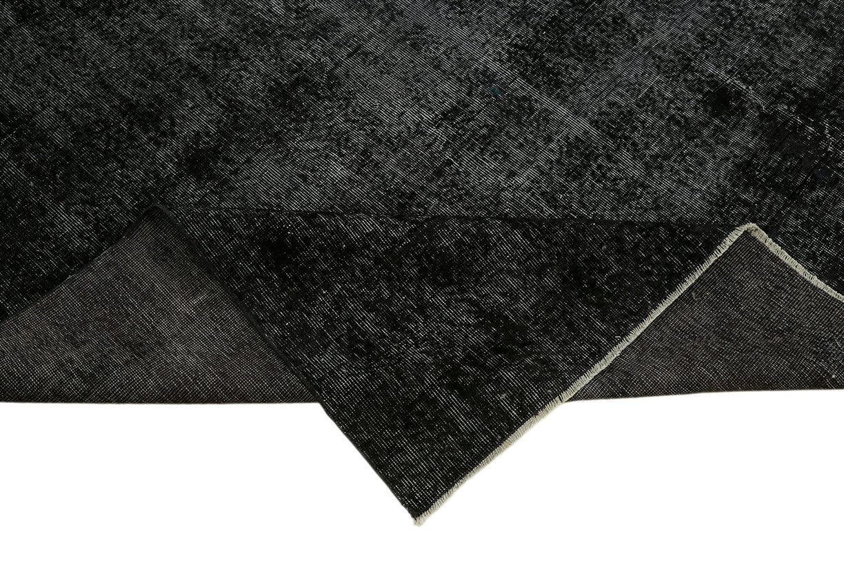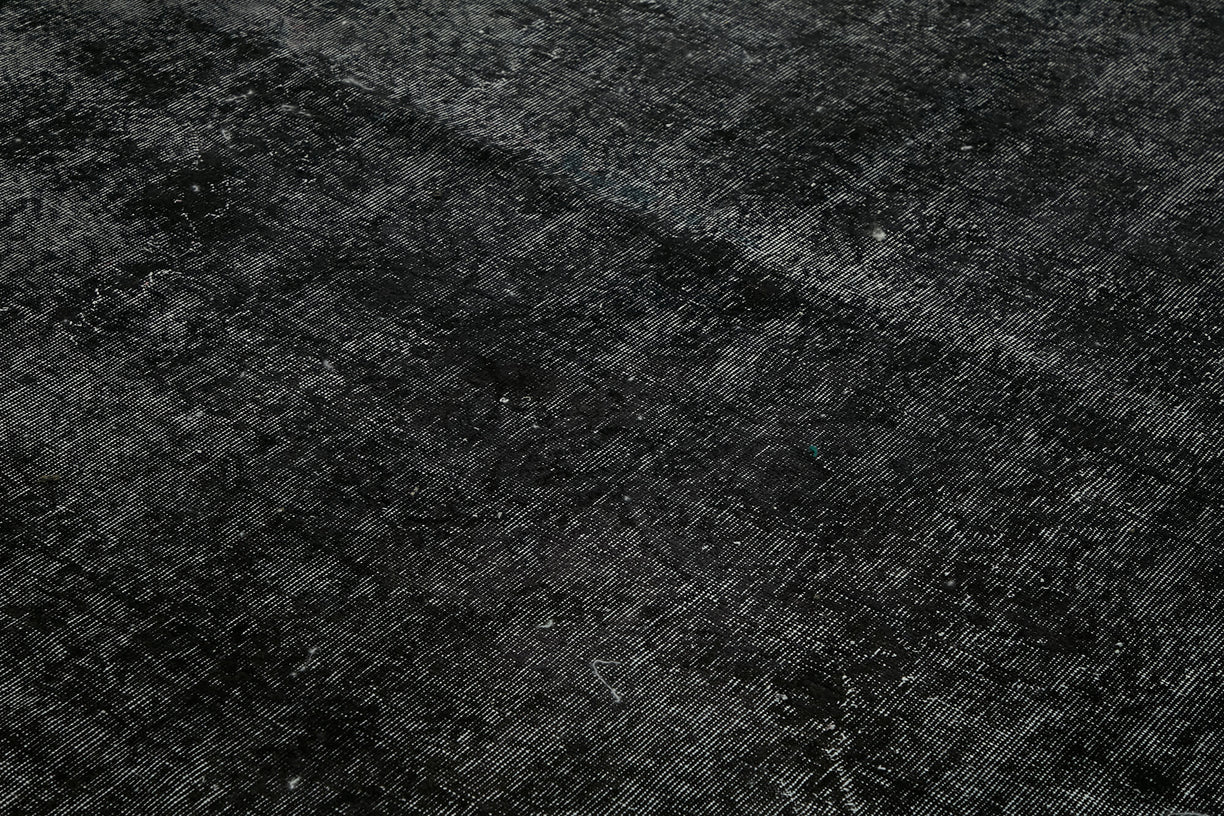 This black over-dyed rug offers a contemporary look with abstract appeal, crafted from a hand-knotted vintage Oriental rug from the 1960s. it measures 9' 0'' x 12' 1''. The rug undergoes a unique process to lower the pile, desaturate the color, and achieve the perfect hue. This transformation bridges generations of artisanal skill, making it a unique statement piece for modern décor. All our vintage rugs are professionally cleaned before being added to our collection.