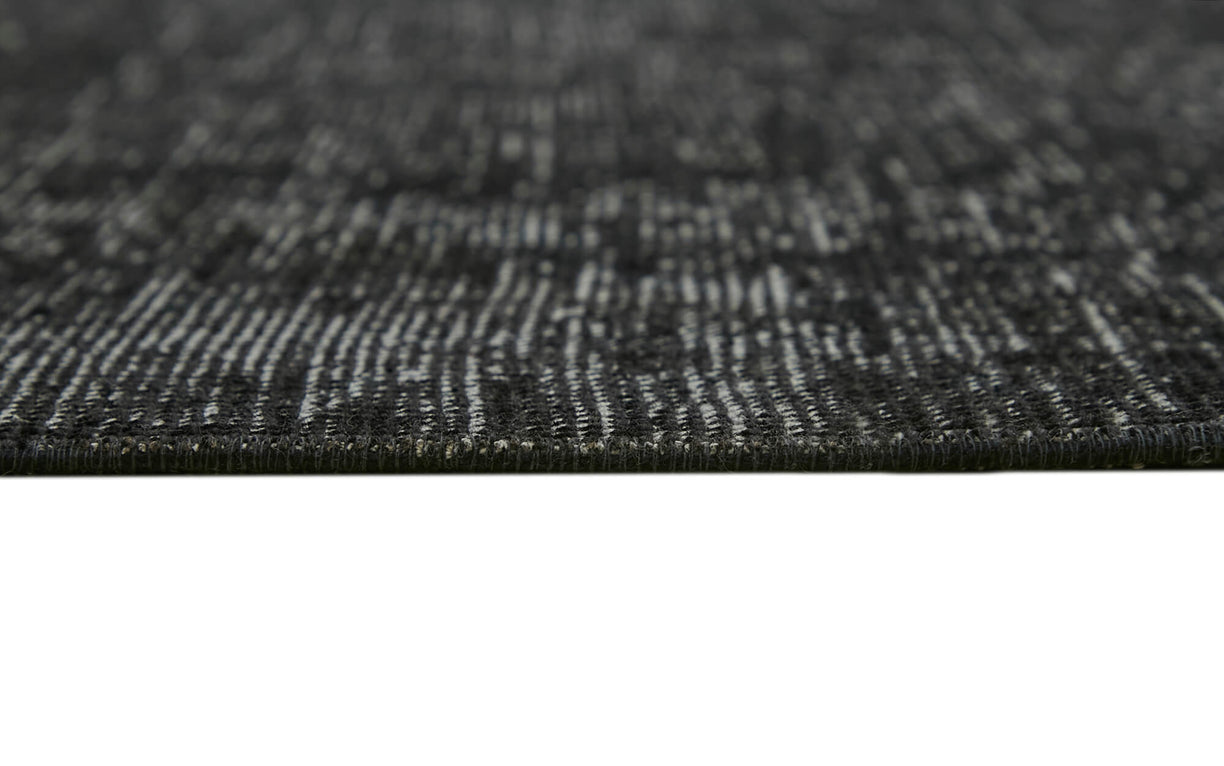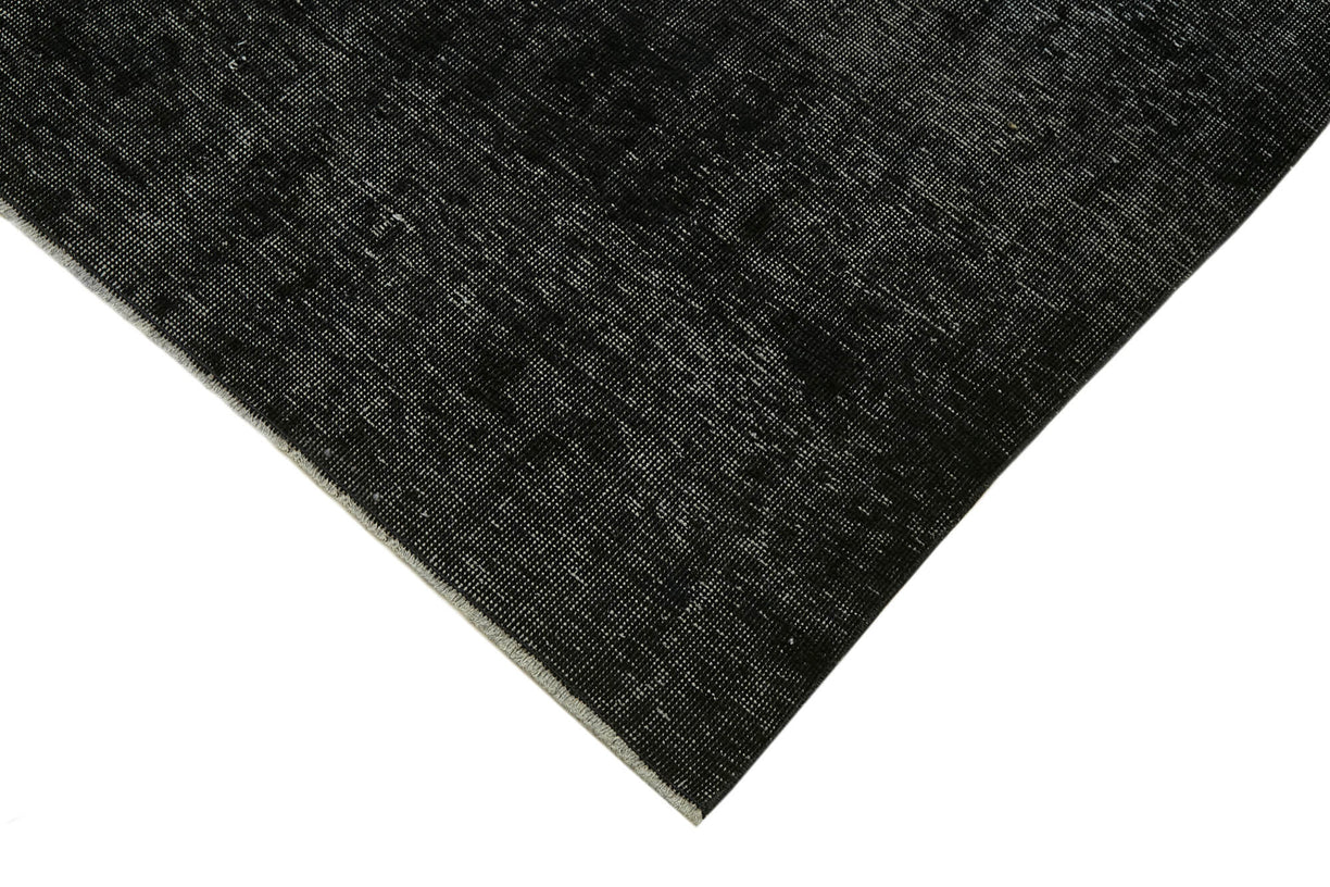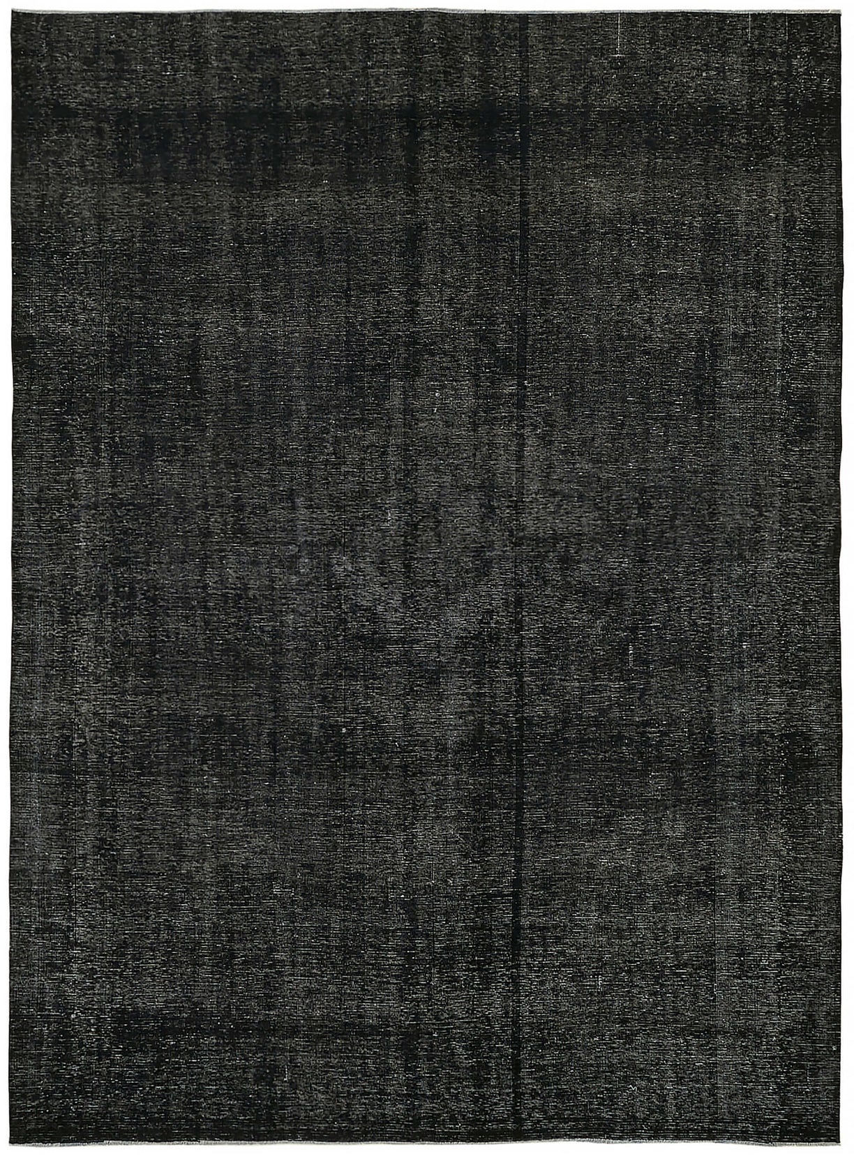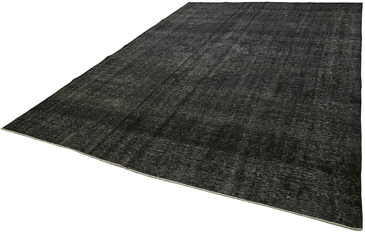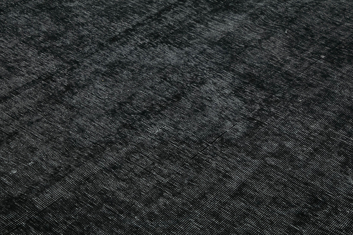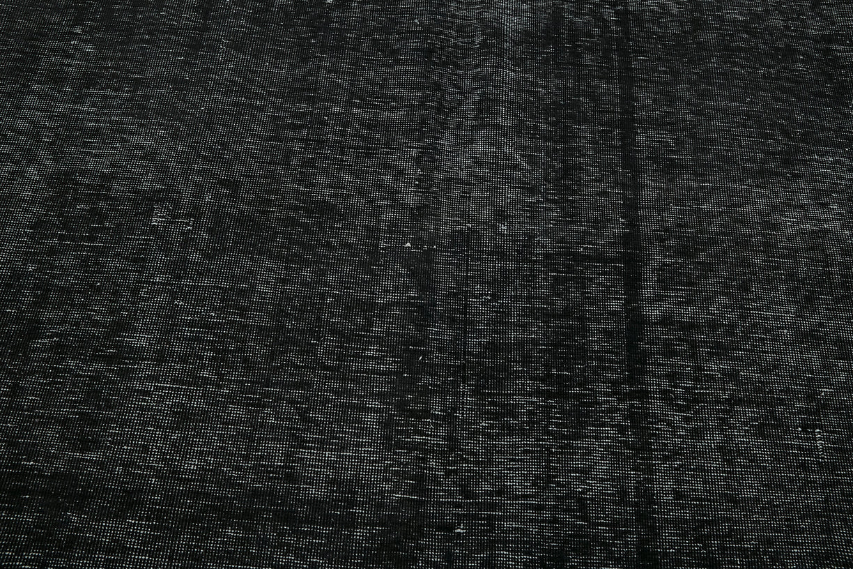 This black over-dyed rug offers a contemporary look with abstract appeal, crafted from a hand-knotted vintage Oriental rug from the 1960s. it measures 9' 5'' x 12' 6''. The rug undergoes a unique process to lower the pile, desaturate the color, and achieve the perfect hue. This transformation bridges generations of artisanal skill, making it a unique statement piece for modern décor. All our vintage rugs are professionally cleaned before being added to our collection.