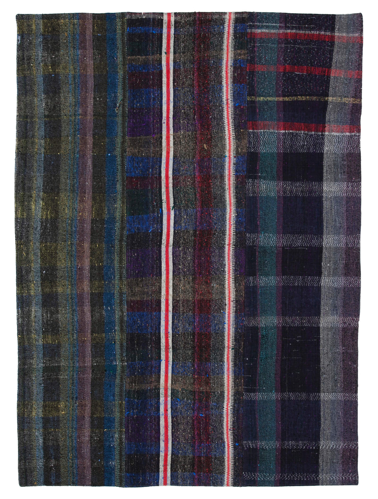 Colorful patchwork rug crafted from vintage Turkish 'chaput' fragments, also known as rag rugs. These unique Turkish chaput kilims are flatweaves handmade from recycled cotton, wool, and goat hair fabrics. Originally woven on narrow looms, chaput panels were later sewn together to create two or even three-winged reversible rugs. Chaput weaving, a traditional practice in Asia Minor, creatively reuses old textiles, forming eco-friendly, one-of-a-kind pieces with rich color and texture. Historically used as runners, area rugs, or bed covers, each vintage chaput patchwork rug showcases an authentic palette, unredyed and rich in character.
