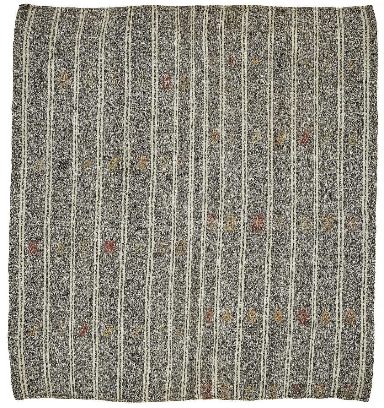 This handwoven kilim is crafted from a unique blend of goat hair and wool, a time-honored material combination used by Anatolian tribes for centuries. Known for its stiff, coarse texture, goat hair was traditionally used to make tents, saddle bags, and floor coverings due to its incredible durability and weather resistance.These vintage kilims, usually 40–60 years old, are perfect for high-traffic areas such as hallways, entryways, and office floors. The strong fiber structure allows the rug to lie flat and maintain its form over time.