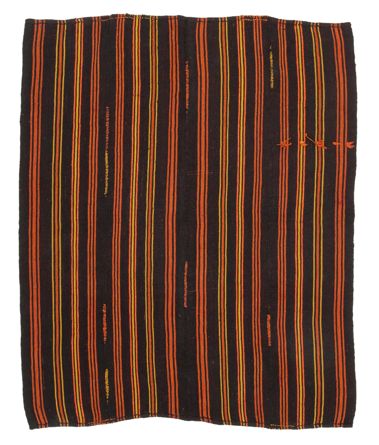 This handwoven kilim is crafted from a unique blend of goat hair and wool, a time-honored material combination used by Anatolian tribes for centuries. Known for its stiff, coarse texture, goat hair was traditionally used to make tents, saddle bags, and floor coverings due to its incredible durability and weather resistance.These vintage kilims, usually 40–60 years old, are perfect for high-traffic areas such as hallways, entryways, and office floors. The strong fiber structure allows the rug to lie flat and maintain its form over time.