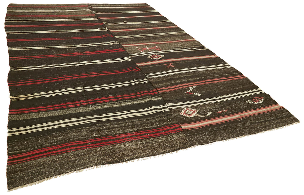 This handwoven kilim is crafted from a unique blend of goat hair and wool, a time-honored material combination used by Anatolian tribes for centuries. Known for its stiff, coarse texture, goat hair was traditionally used to make tents, saddle bags, and floor coverings due to its incredible durability and weather resistance.These vintage kilims, usually 40–60 years old, are perfect for high-traffic areas such as hallways, entryways, and office floors. The strong fiber structure allows the rug to lie flat and maintain its form over time.
