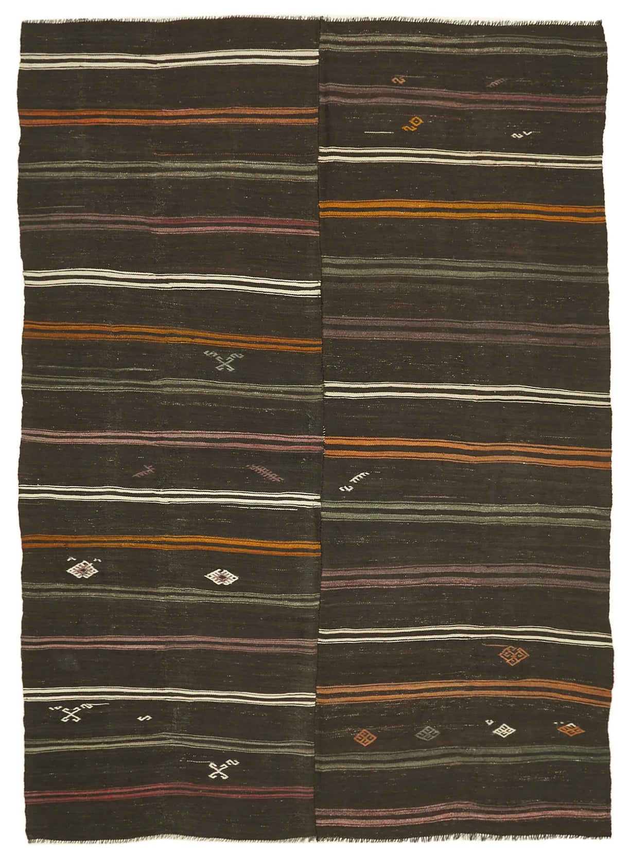 This handwoven kilim is crafted from a unique blend of goat hair and wool, a time-honored material combination used by Anatolian tribes for centuries. Known for its stiff, coarse texture, goat hair was traditionally used to make tents, saddle bags, and floor coverings due to its incredible durability and weather resistance.These vintage kilims, usually 40–60 years old, are perfect for high-traffic areas such as hallways, entryways, and office floors. The strong fiber structure allows the rug to lie flat and maintain its form over time.