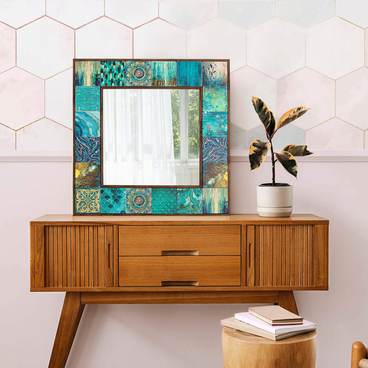 Elevate your interior décor with our exquisite collection of handmade tile mirrors, exclusively crafted in the heart of Turkey. Each mirror is a testament to our artisanal expertise, meticulously handcrafted from the finest tile and travertine stones. What sets our mirrors apart is the natural wood used for their frames, adding a touch of warmth and authenticity to the design. The glass of the mirror has been produced as a premium quality, ensuring clear reflections and durability. But that's not all – our tiles are as unique as your own style. Each model boasts a distinct design and color, ensuring that you can easily decorate your space to harmonize with your interior design. Our unique mirrors come in various sizes, including small, medium, and large, allowing you to choose the perfect fit for any space in your home. Whether you're seeking a wall hanging mirror, a pier glass mirror, or a statement-making large size mirror, we have a diverse range of options to meet your aesthetic desires. Looking for something truly one-of-a-kind? We also offer custom-made mirrors, although pricing may show some differences. With our handmade mirrors, you'll add an unparalleled touch of elegance to your space, all while supporting traditional Turkish craftsmanship.