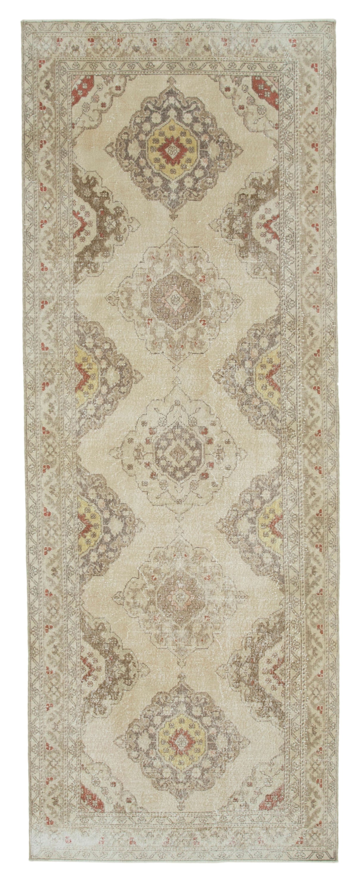 Beige Turkish Runners combine traditional and modern styles. Skilled artisans make them from 40 to 60-year-old hand-knotted Turkish carpets, carefully selected for their quality. The production process involves thorough cleaning and preserving of the original patterns.