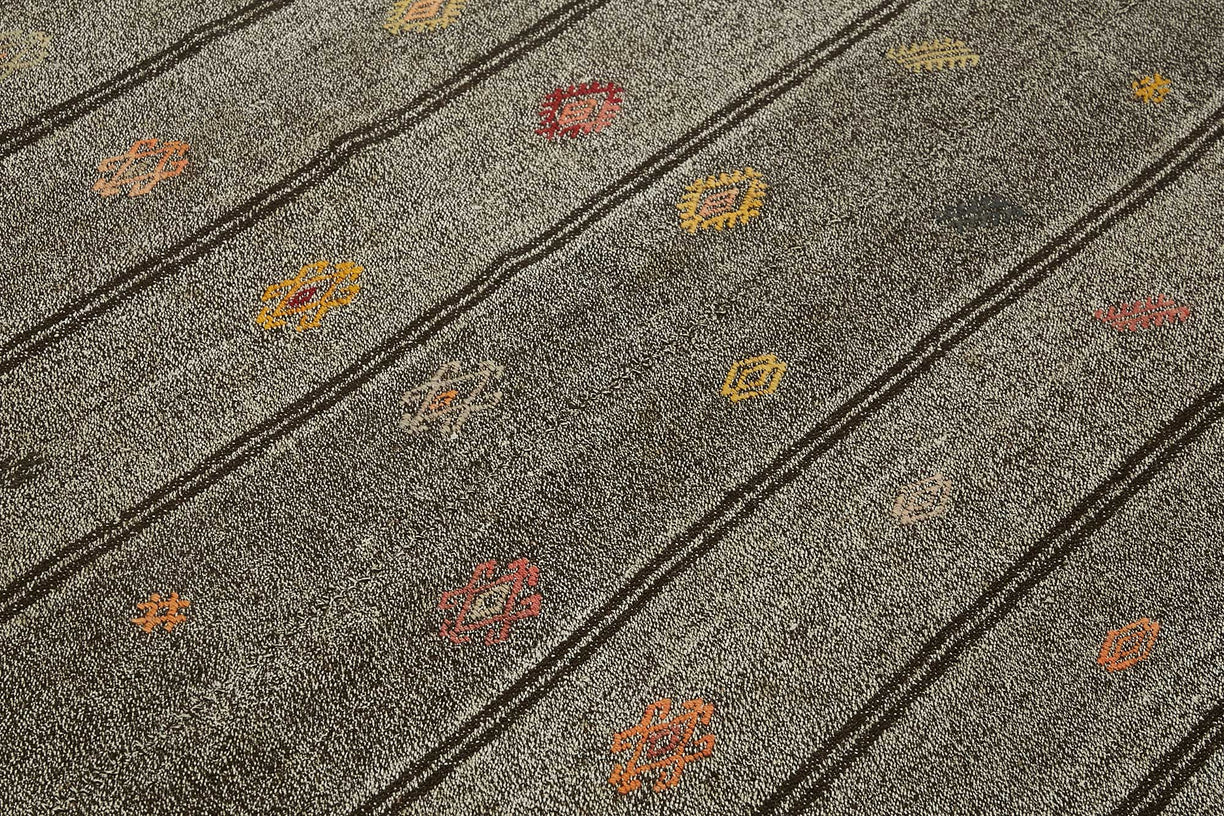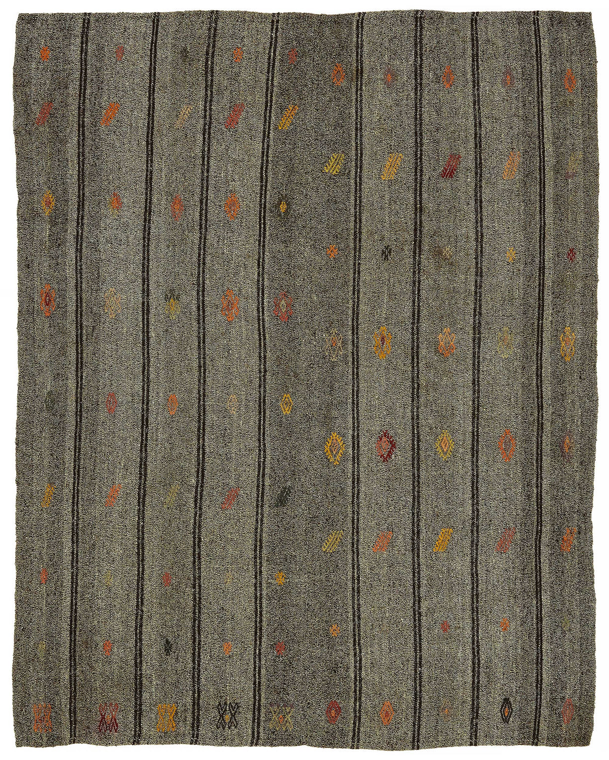 This handwoven kilim is crafted from a unique blend of goat hair and wool, a time-honored material combination used by Anatolian tribes for centuries. Known for its stiff, coarse texture, goat hair was traditionally used to make tents, saddle bags, and floor coverings due to its incredible durability and weather resistance.These vintage kilims, usually 40–60 years old, are perfect for high-traffic areas such as hallways, entryways, and office floors. The strong fiber structure allows the rug to lie flat and maintain its form over time.