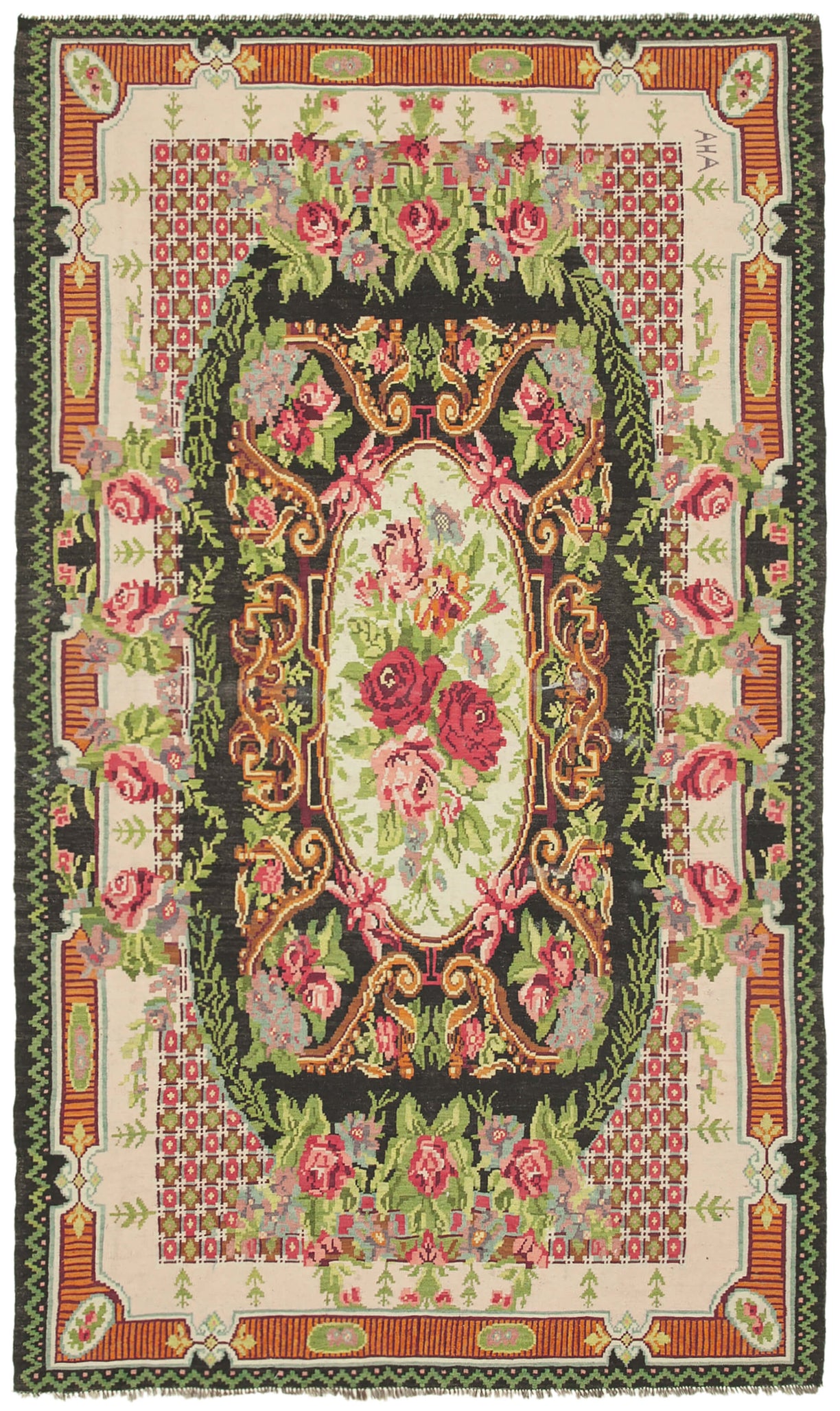 Authentic Floral Kilim Rug, woven by hand in the 70s, showcasing a beautiful floral motif and timeless design. In superb condition, it’s an ideal addition to both modern and eclectic decor. To protect and preserve, consider using a rug pad.