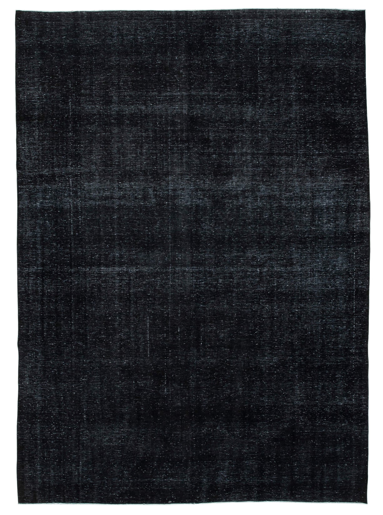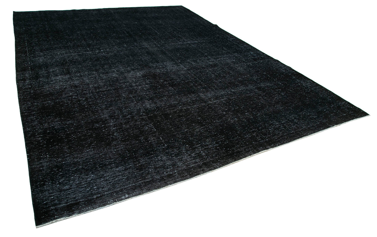This black over-dyed rug offers a contemporary look with abstract appeal, crafted from a hand-knotted vintage Oriental rug from the 1960s. it measures 9' 9'' x 13' 7''. The rug undergoes a unique process to lower the pile, desaturate the color, and achieve the perfect hue. This transformation bridges generations of artisanal skill, making it a unique statement piece for modern décor. All our vintage rugs are professionally cleaned before being added to our collection.