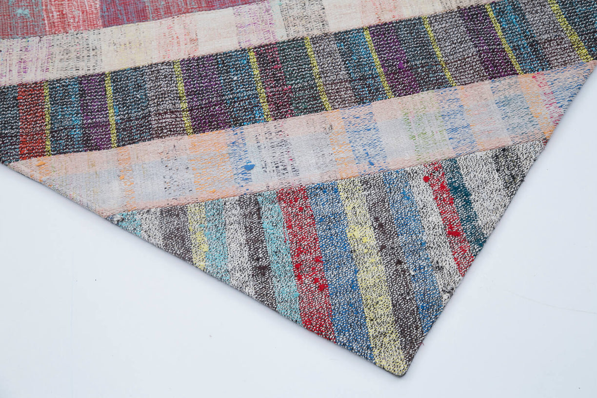 Colorful patchwork rug crafted from vintage Turkish 'chaput' fragments, also known as rag rugs. These unique Turkish chaput kilims are flatweaves handmade from recycled cotton, wool, and goat hair fabrics. Originally woven on narrow looms, chaput panels were later sewn together to create two or even three-winged reversible rugs. Chaput weaving, a traditional practice in Asia Minor, creatively reuses old textiles, forming eco-friendly, one-of-a-kind pieces with rich color and texture. Historically used as runners, area rugs, or bed covers, each vintage chaput patchwork rug showcases an authentic palette, unredyed and rich in character.