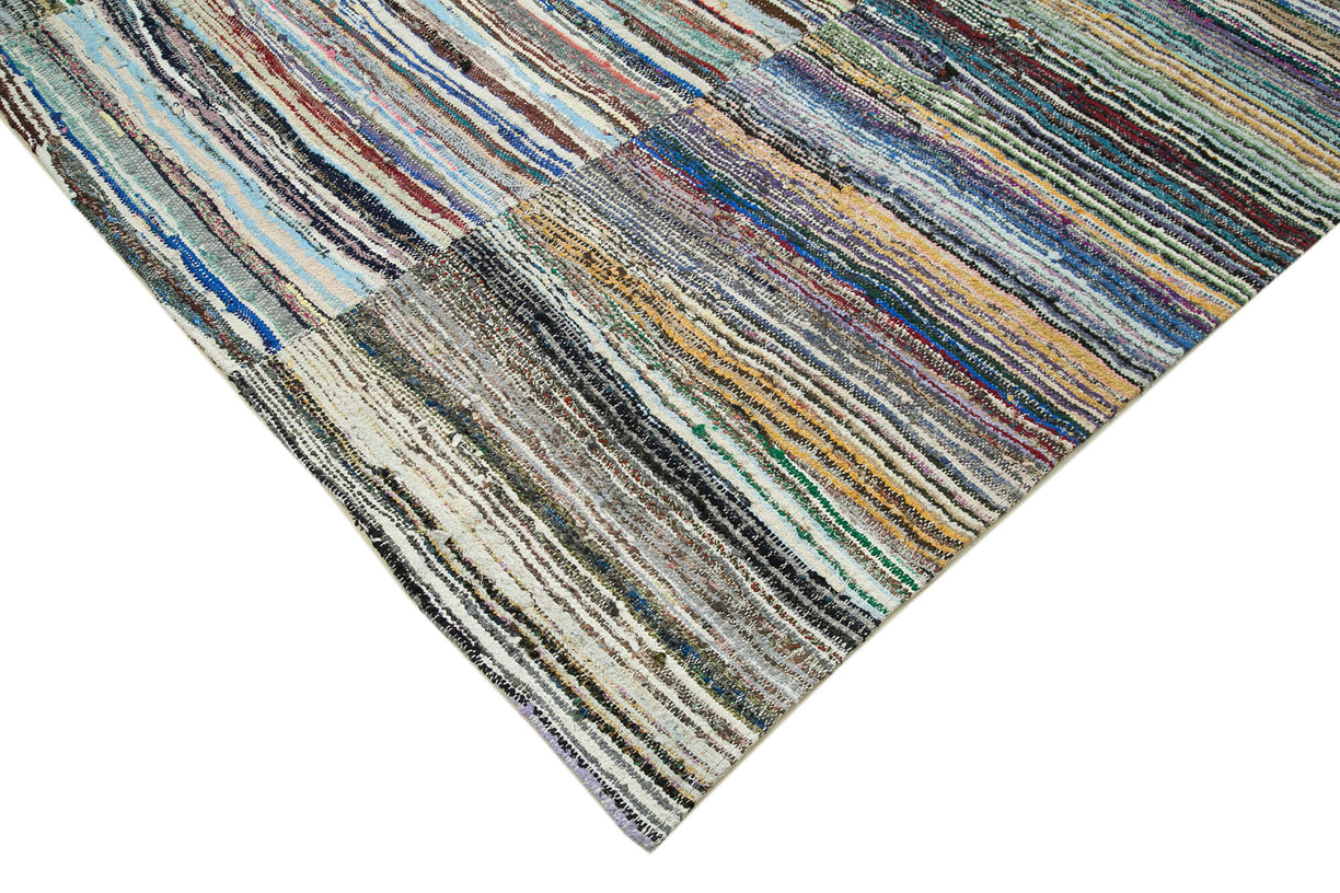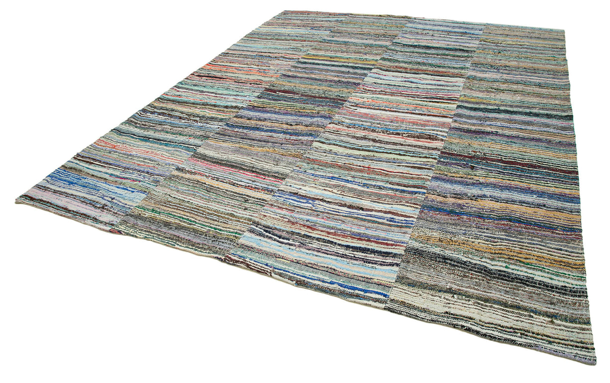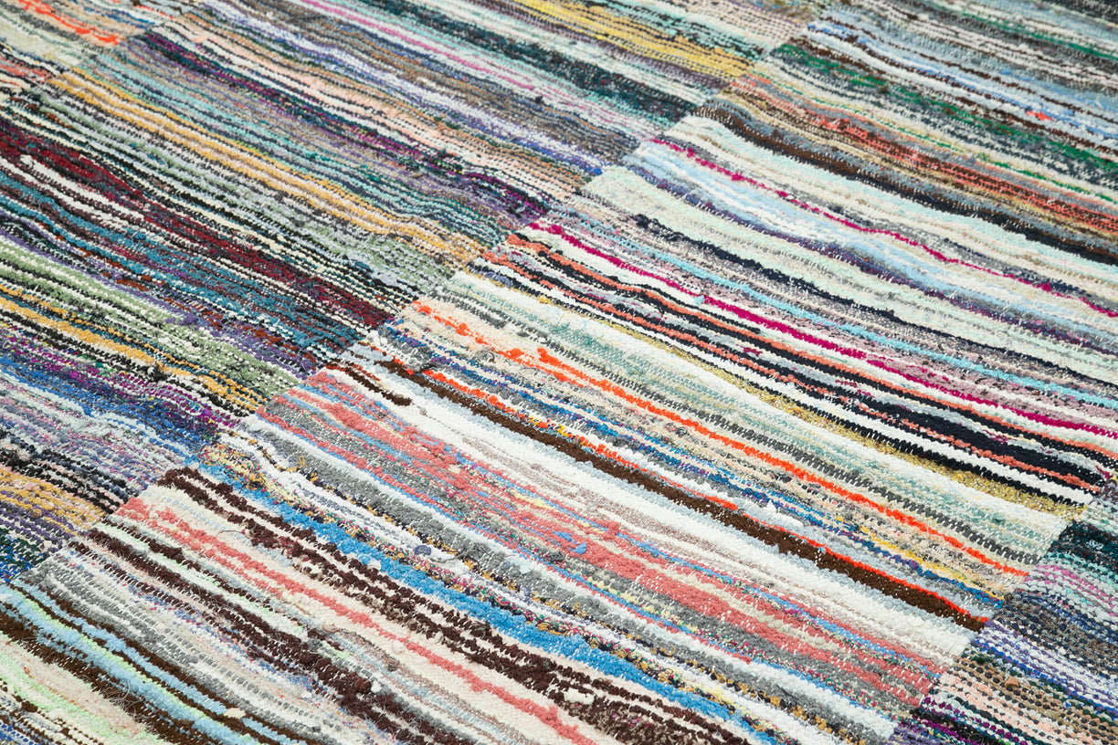 Colorful patchwork rug crafted from vintage Turkish 'chaput' fragments, also known as rag rugs. These unique Turkish chaput kilims are flatweaves handmade from recycled cotton, wool, and goat hair fabrics. Originally woven on narrow looms, chaput panels were later sewn together to create two or even three-winged reversible rugs. Chaput weaving, a traditional practice in Asia Minor, creatively reuses old textiles, forming eco-friendly, one-of-a-kind pieces with rich color and texture. Historically used as runners, area rugs, or bed covers, each vintage chaput patchwork rug showcases an authentic palette, unredyed and rich in character.