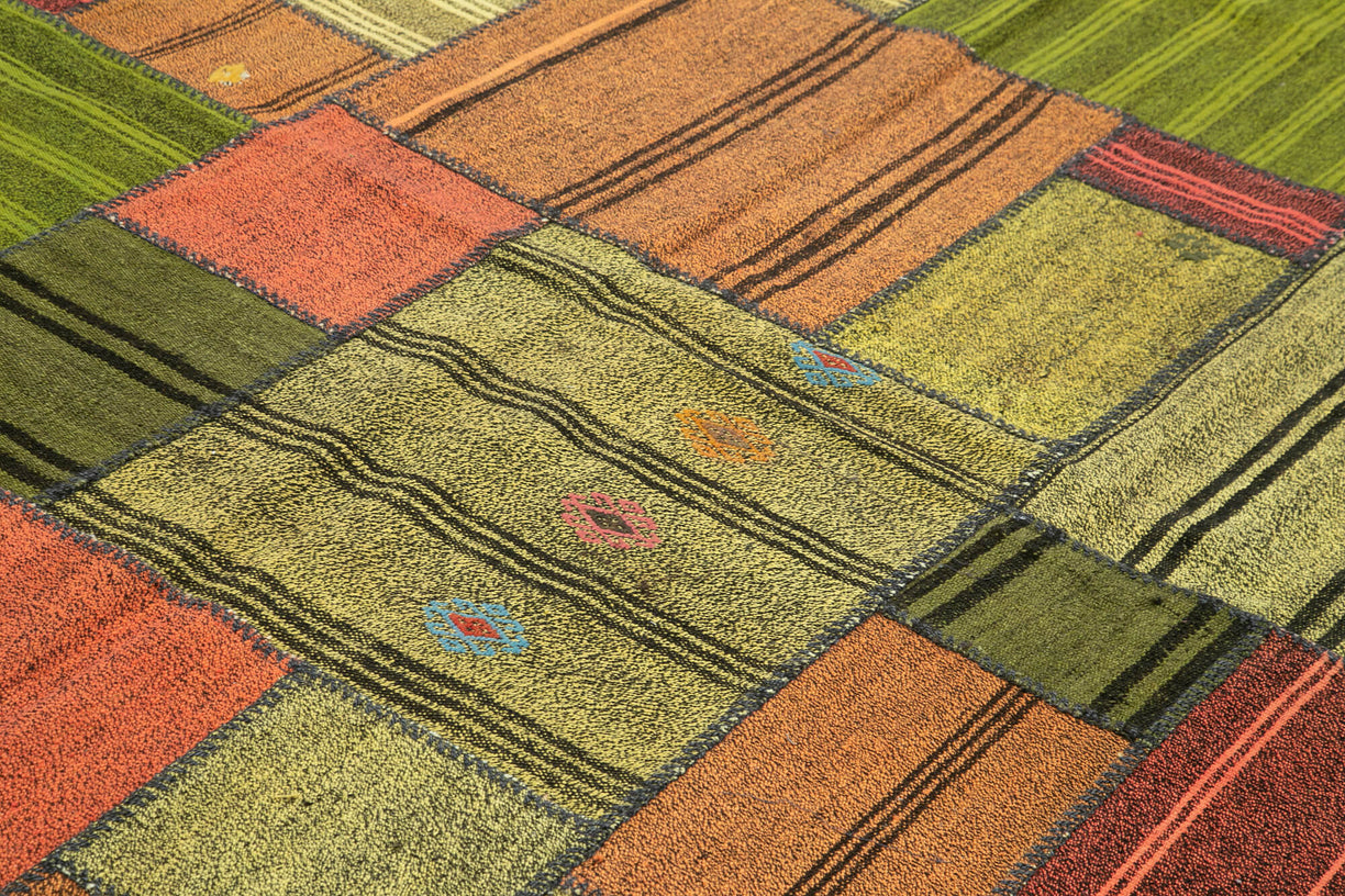 Colorful patchwork rug crafted from vintage Turkish 'chaput' fragments, also known as rag rugs. These unique Turkish chaput kilims are flatweaves handmade from recycled cotton, wool, and goat hair fabrics. Originally woven on narrow looms, chaput panels were later sewn together to create two or even three-winged reversible rugs. Chaput weaving, a traditional practice in Asia Minor, creatively reuses old textiles, forming eco-friendly, one-of-a-kind pieces with rich color and texture. Historically used as runners, area rugs, or bed covers, each vintage chaput patchwork rug showcases an authentic palette, unredyed and rich in character.