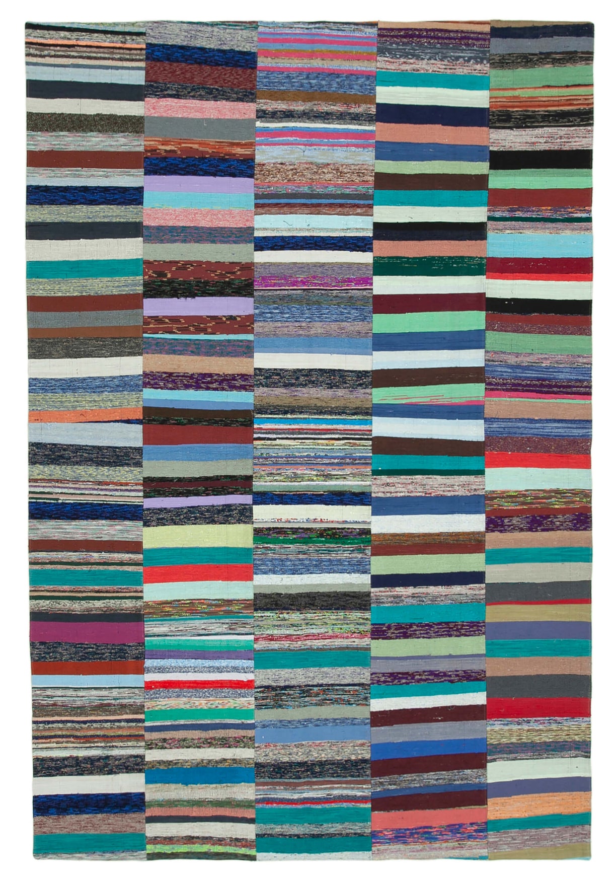 Colorful patchwork rug crafted from vintage Turkish 'chaput' fragments, also known as rag rugs. These unique Turkish chaput kilims are flatweaves handmade from recycled cotton, wool, and goat hair fabrics. Originally woven on narrow looms, chaput panels were later sewn together to create two or even three-winged reversible rugs. Chaput weaving, a traditional practice in Asia Minor, creatively reuses old textiles, forming eco-friendly, one-of-a-kind pieces with rich color and texture. Historically used as runners, area rugs, or bed covers, each vintage chaput patchwork rug showcases an authentic palette, unredyed and rich in character.