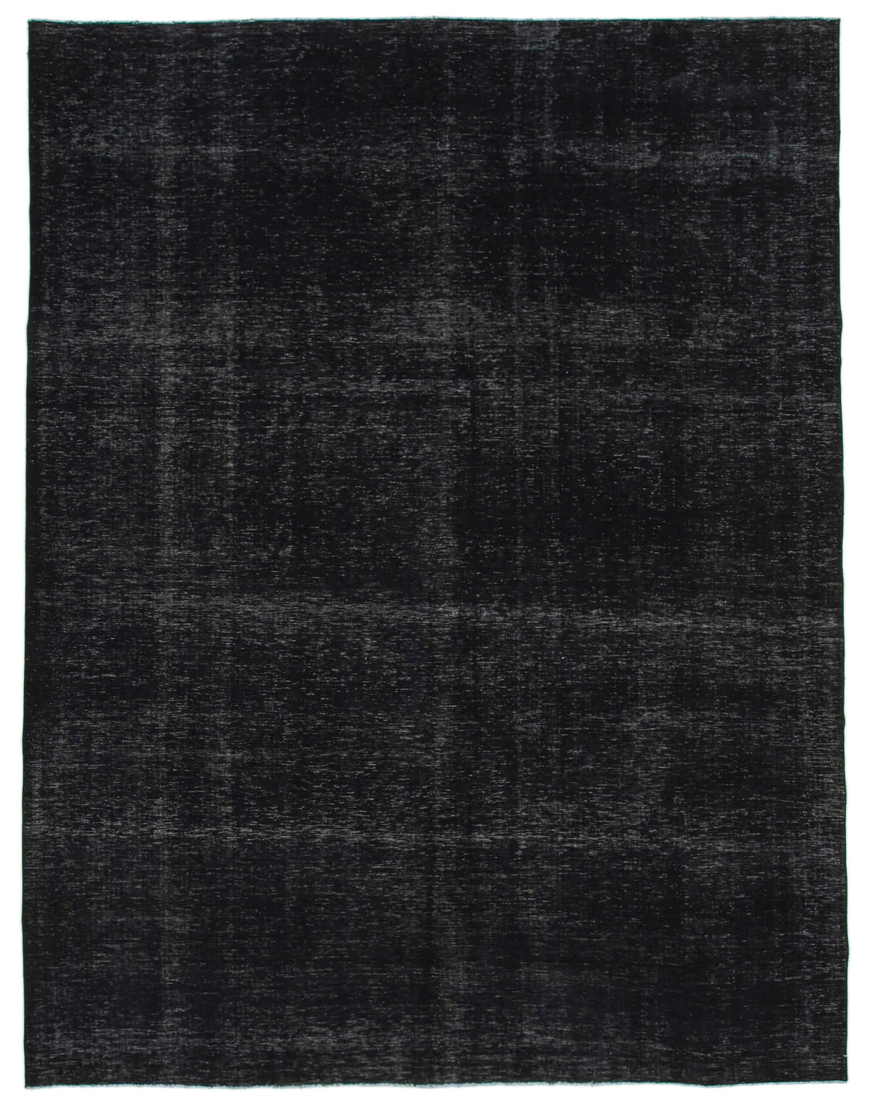 This black over-dyed rug offers a contemporary look with abstract appeal, crafted from a hand-knotted vintage Oriental rug from the 1960s. it measures 9' 10'' x 13' 1''. The rug undergoes a unique process to lower the pile, desaturate the color, and achieve the perfect hue. This transformation bridges generations of artisanal skill, making it a unique statement piece for modern décor. All our vintage rugs are professionally cleaned before being added to our collection.
