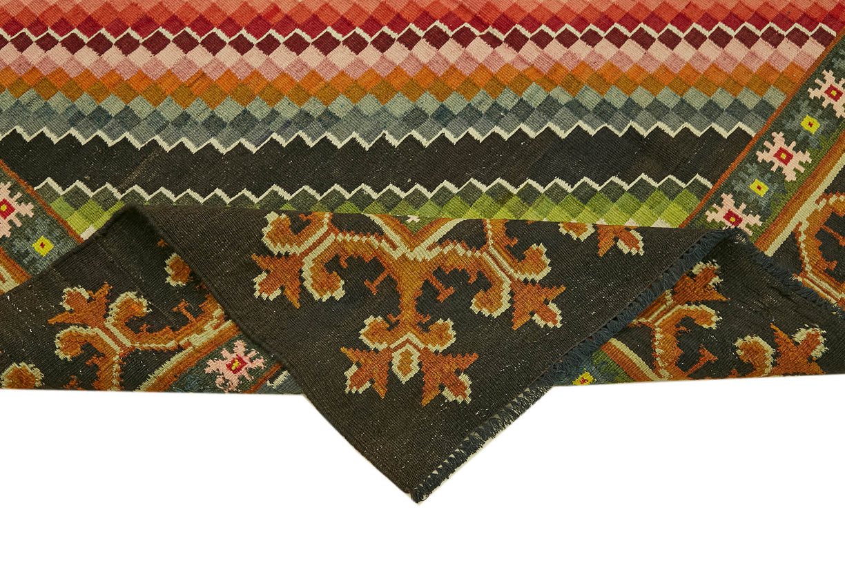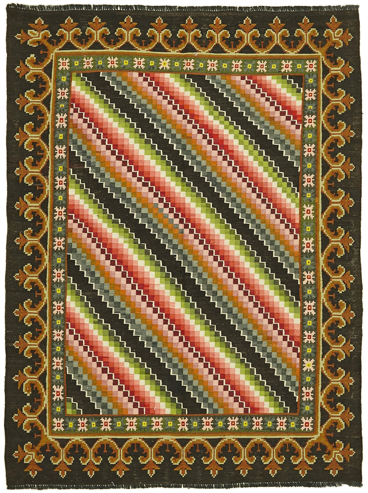 Moldavian Kilims are a unique type of European kilim, made from flat-woven textiles, primarily using wool on wool with occasional small segments using cotton. They stand out due to their distinctive colour scheme, mainly consisting of two colours: black and various brown shades. This is achieved by using natural goat hair color and the nuanced hues of sheep's wool. The main colour is left undyed, but dyes are used for complex patterns, creating a striking contrast.