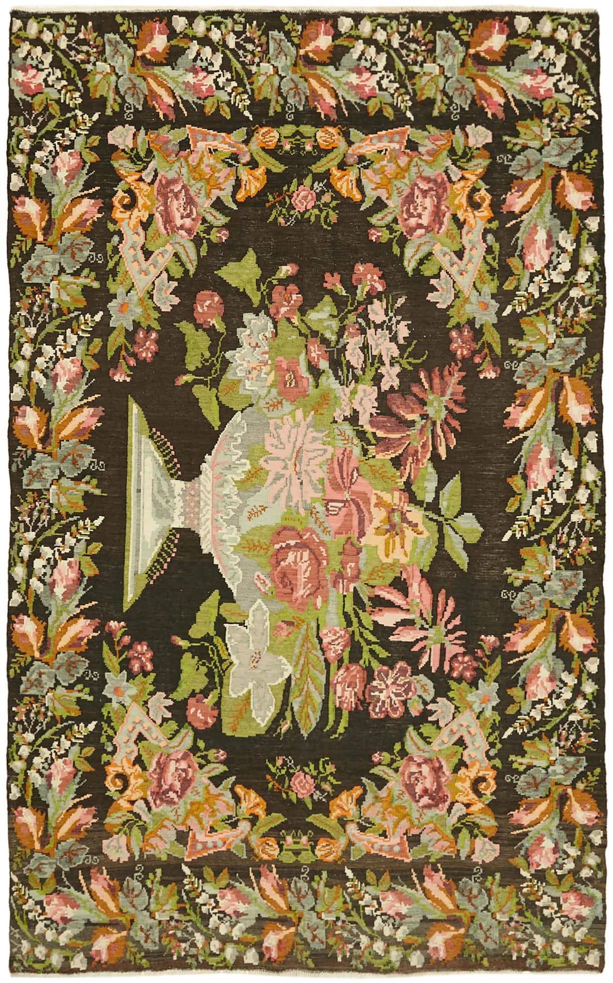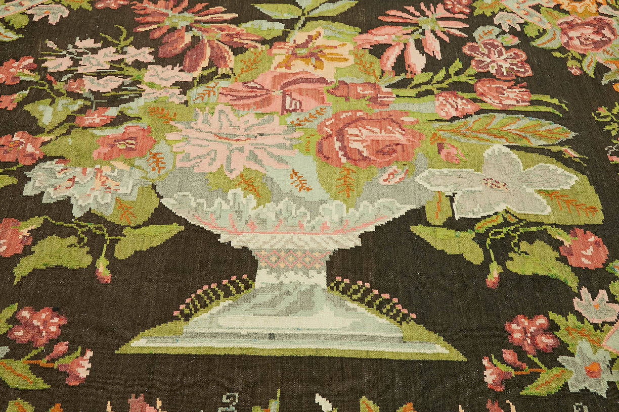 Elegant Handmade Moldovan Kilim, hand-woven in the 70s, featuring a vibrant floral pattern and rich colors. This vintage rug is in excellent condition and perfect for adding a touch of bohemian or eclectic flair to any space. A rug pad is recommended for added comfort and durability.