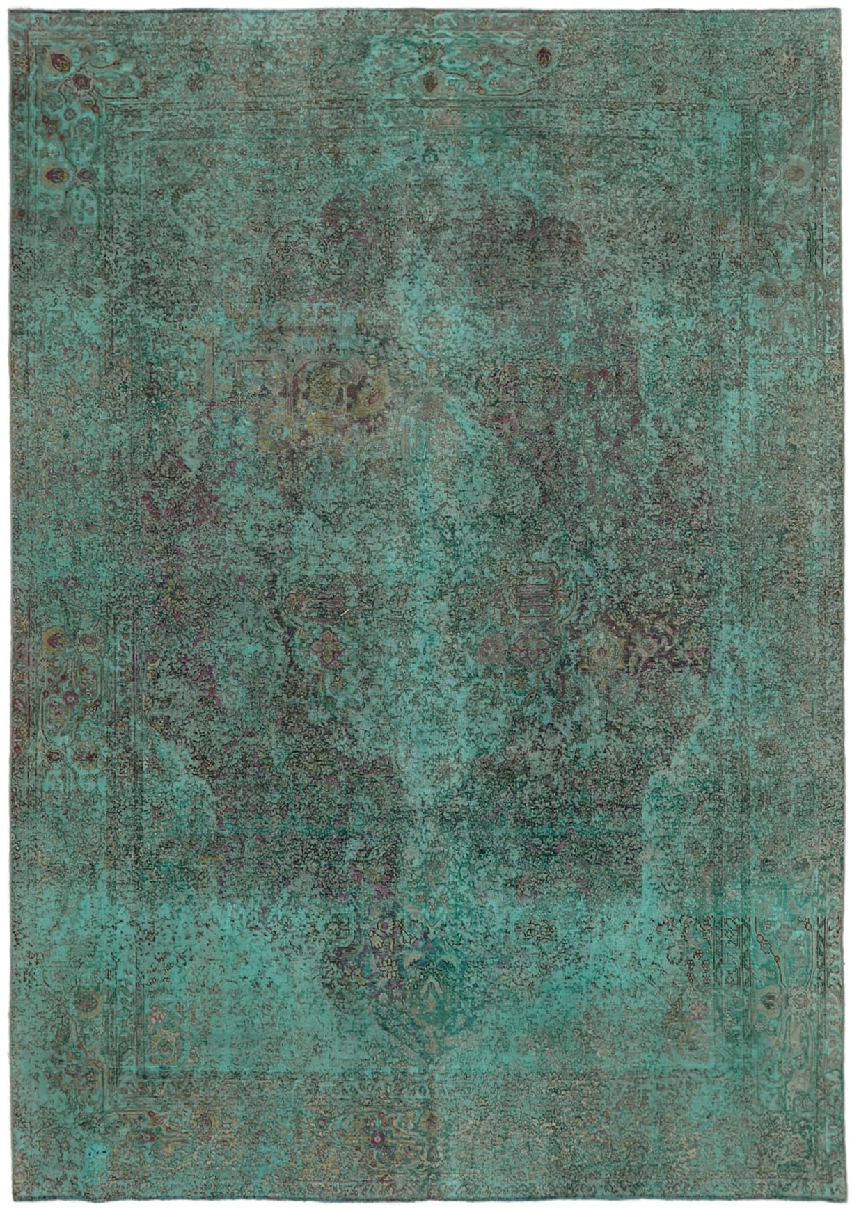 This turquoise over-dyed rug offers a contemporary look with abstract appeal, crafted from a hand-knotted vintage Oriental rug from the 1960s. it measures 7' 10'' x 11' 0''. The rug undergoes a unique process to lower the pile, desaturate the color, and achieve the perfect hue. This transformation bridges generations of artisanal skill, making it a unique statement piece for modern décor. All our vintage rugs are professionally cleaned before being added to our collection.