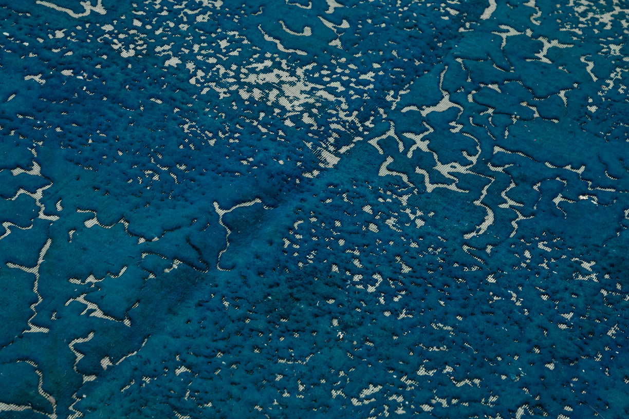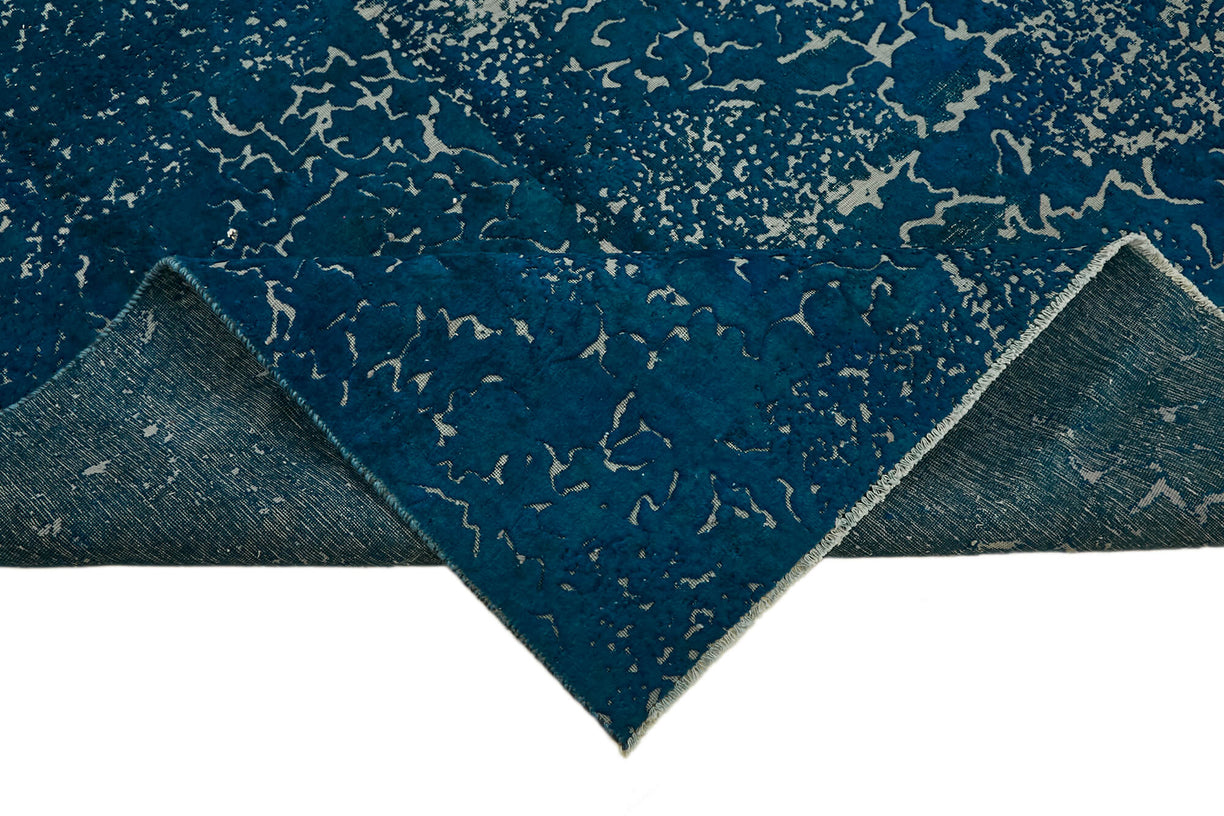 This blue over-dyed rug offers a contemporary look with abstract appeal, crafted from a hand-knotted vintage Oriental rug from the 1960s. it measures 5' 11'' x 9' 11''. The rug undergoes a unique process to lower the pile, desaturate the color, and achieve the perfect hue. This transformation bridges generations of artisanal skill, making it a unique statement piece for modern décor. All our vintage rugs are professionally cleaned before being added to our collection.