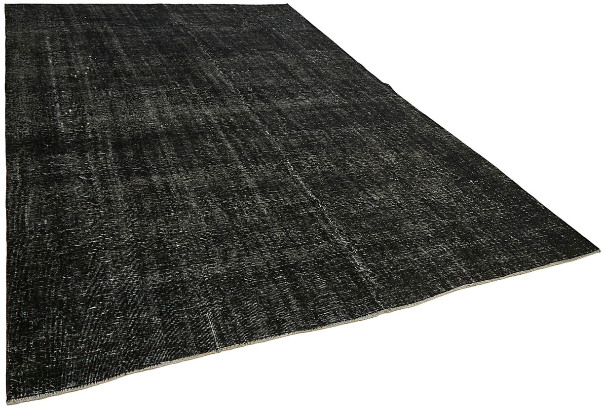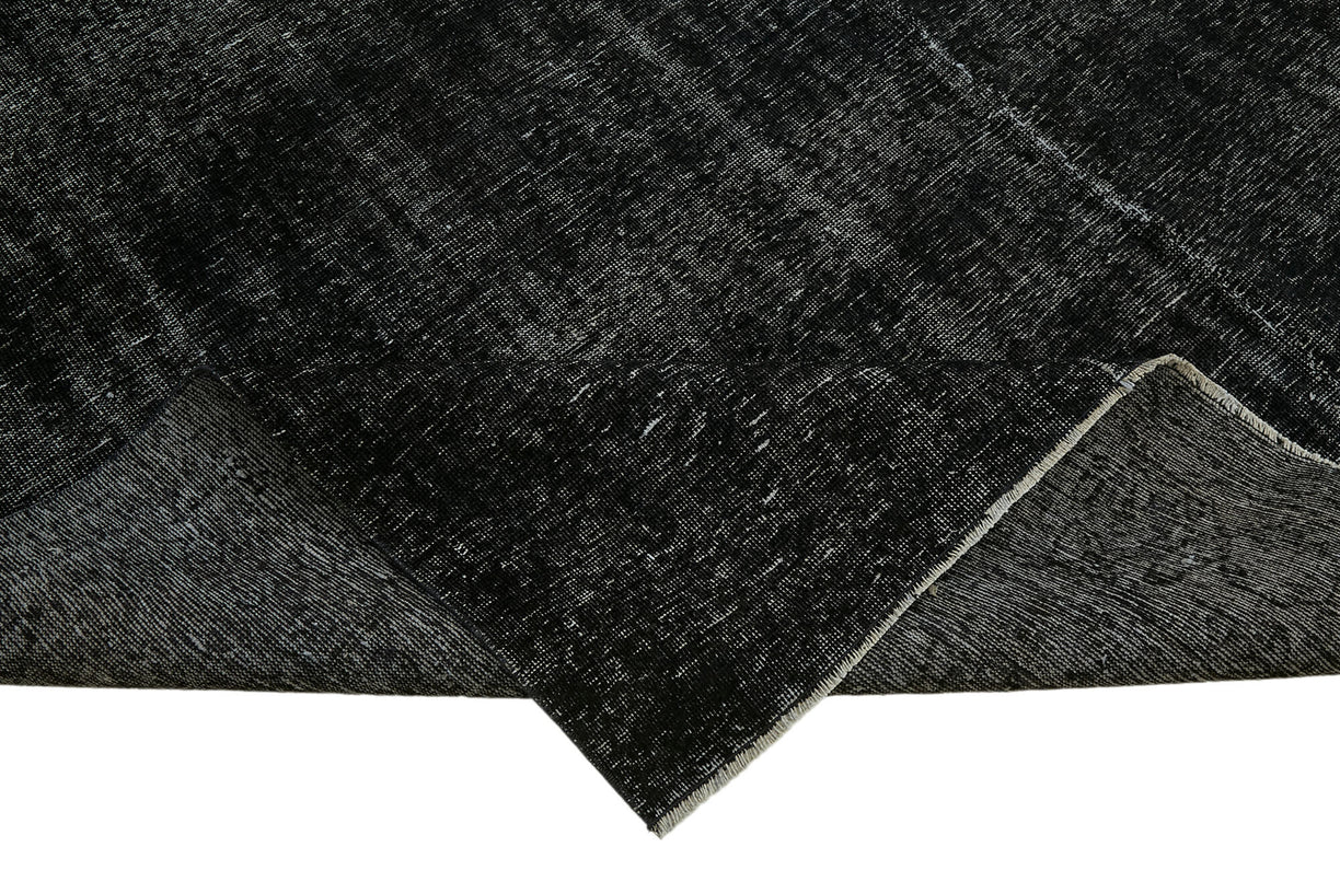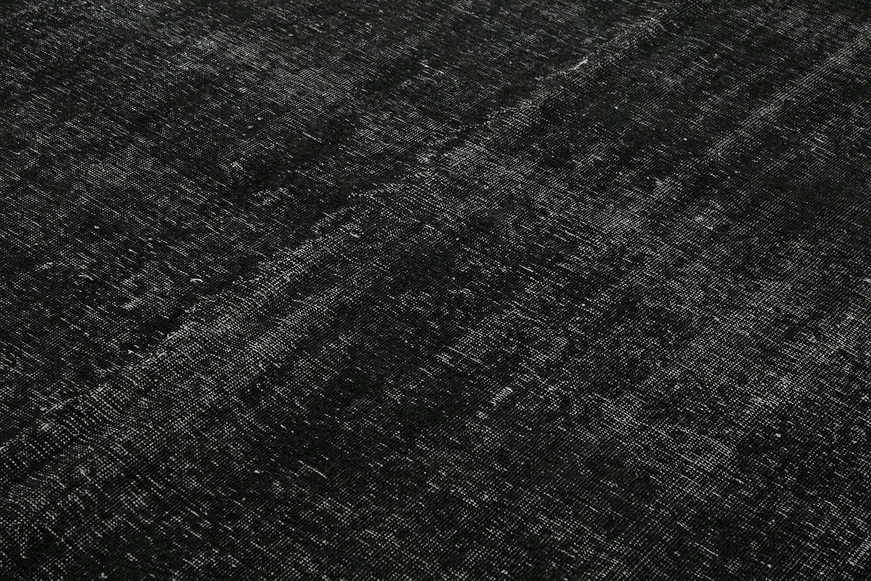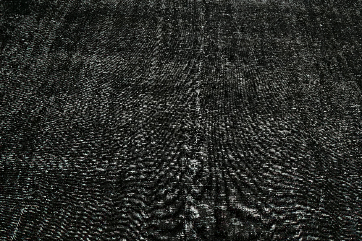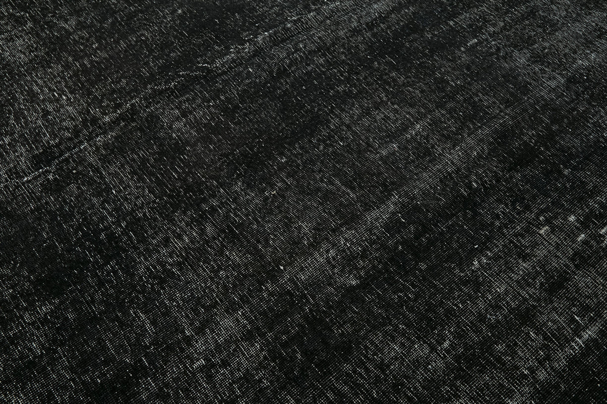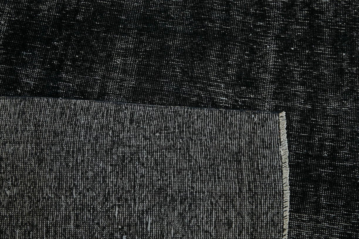 This black over-dyed rug offers a contemporary look with abstract appeal, crafted from a hand-knotted vintage Oriental rug from the 1960s. it measures 8' 8'' x 12' 4''. The rug undergoes a unique process to lower the pile, desaturate the color, and achieve the perfect hue. This transformation bridges generations of artisanal skill, making it a unique statement piece for modern décor. All our vintage rugs are professionally cleaned before being added to our collection.