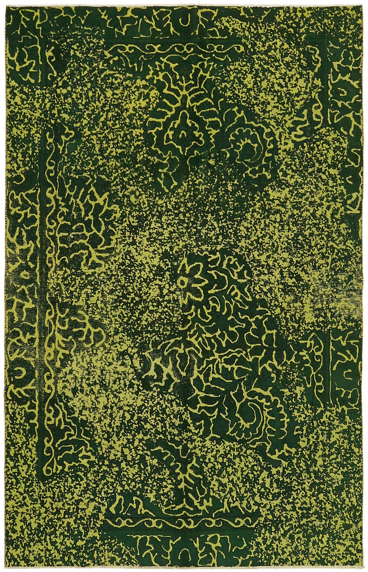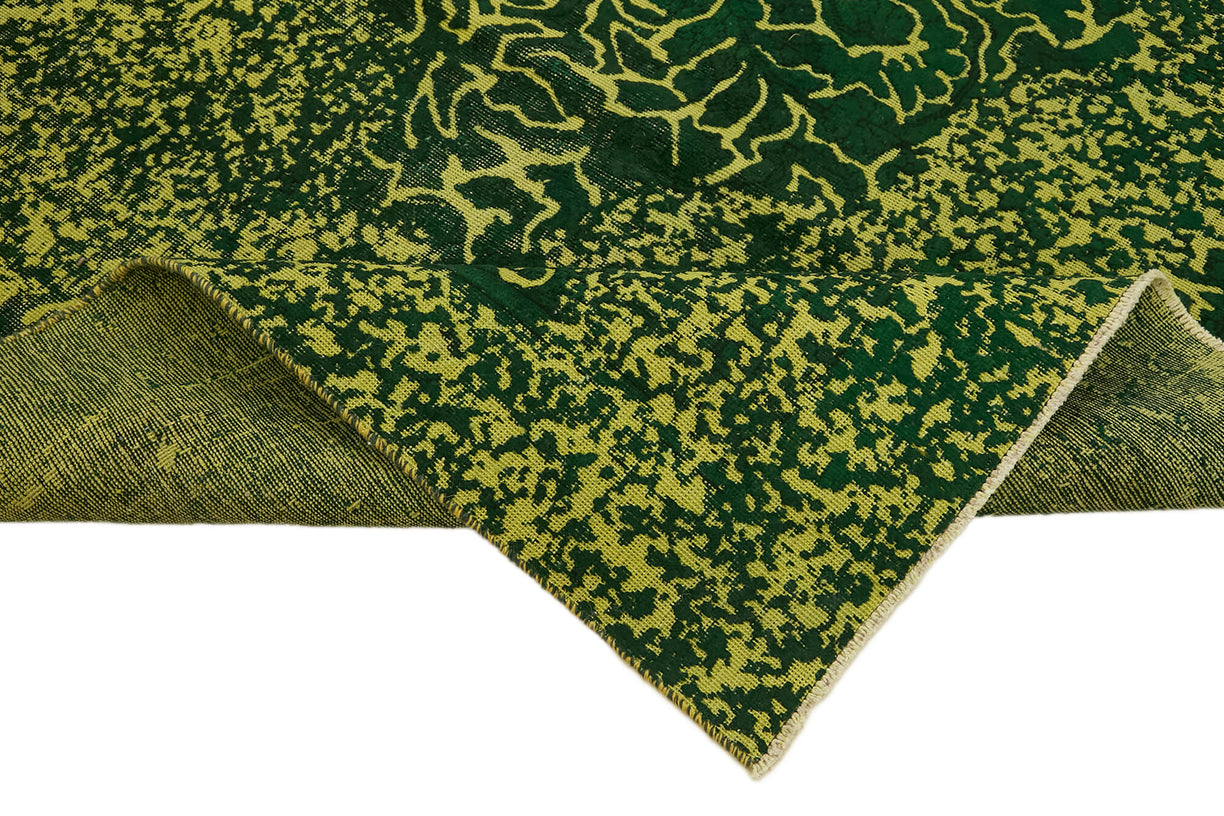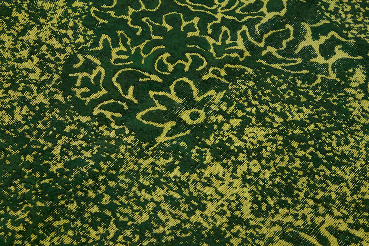This green over-dyed rug offers a contemporary look with abstract appeal, crafted from a hand-knotted vintage Oriental rug from the 1960s. it measures 5' 9'' x 8' 10''. The rug undergoes a unique process to lower the pile, desaturate the color, and achieve the perfect hue. This transformation bridges generations of artisanal skill, making it a unique statement piece for modern décor. All our vintage rugs are professionally cleaned before being added to our collection.