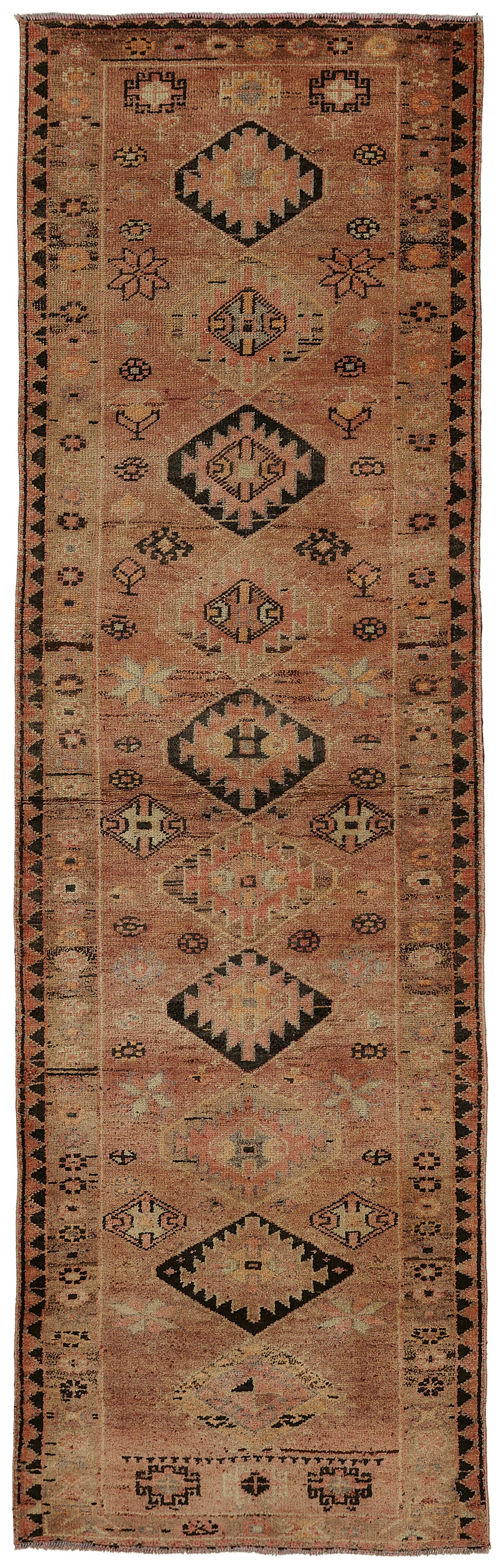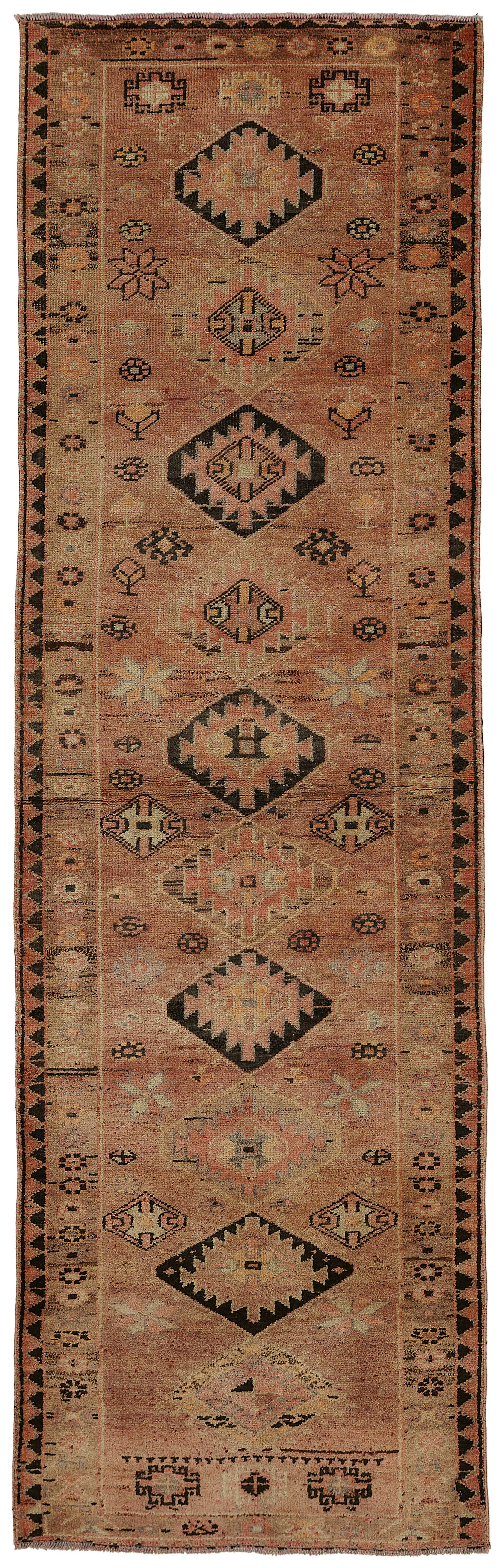 This exquisite runner rug is a rare example of tribal craftsmanship, hand-knotted by the women of the Herki tribe during the 1930s and 1940s. Made with exceptional-quality wool and tightly knotted to create a dense, medium-pile texture, these rugs are known for their lasting strength and luxurious feel underfoot.