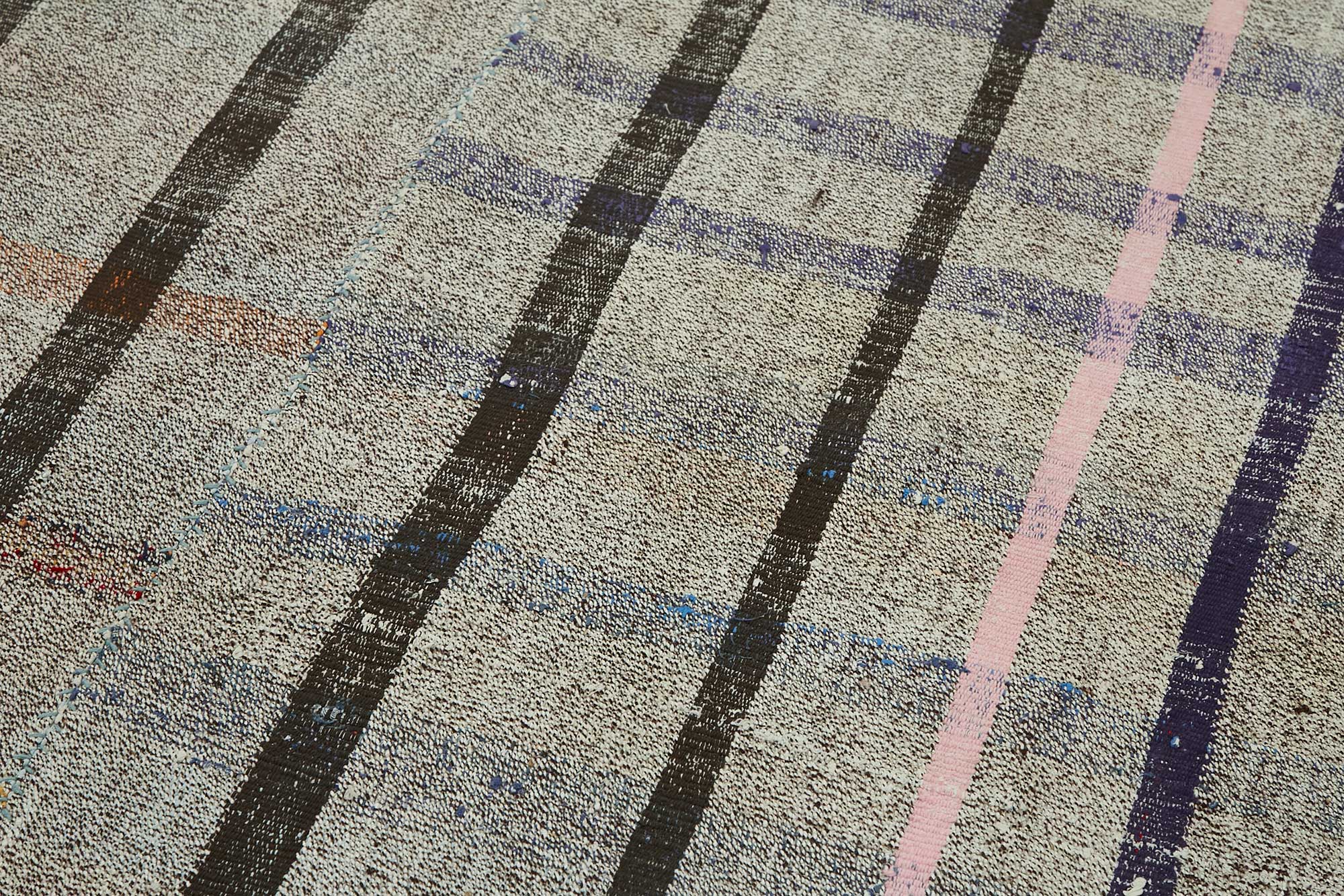 This handwoven kilim is crafted from a unique blend of goat hair and wool, a time-honored material combination used by Anatolian tribes for centuries. Known for its stiff, coarse texture, goat hair was traditionally used to make tents, saddle bags, and floor coverings due to its incredible durability and weather resistance.These vintage kilims, usually 40–60 years old, are perfect for high-traffic areas such as hallways, entryways, and office floors. The strong fiber structure allows the rug to lie flat and maintain its form over time.