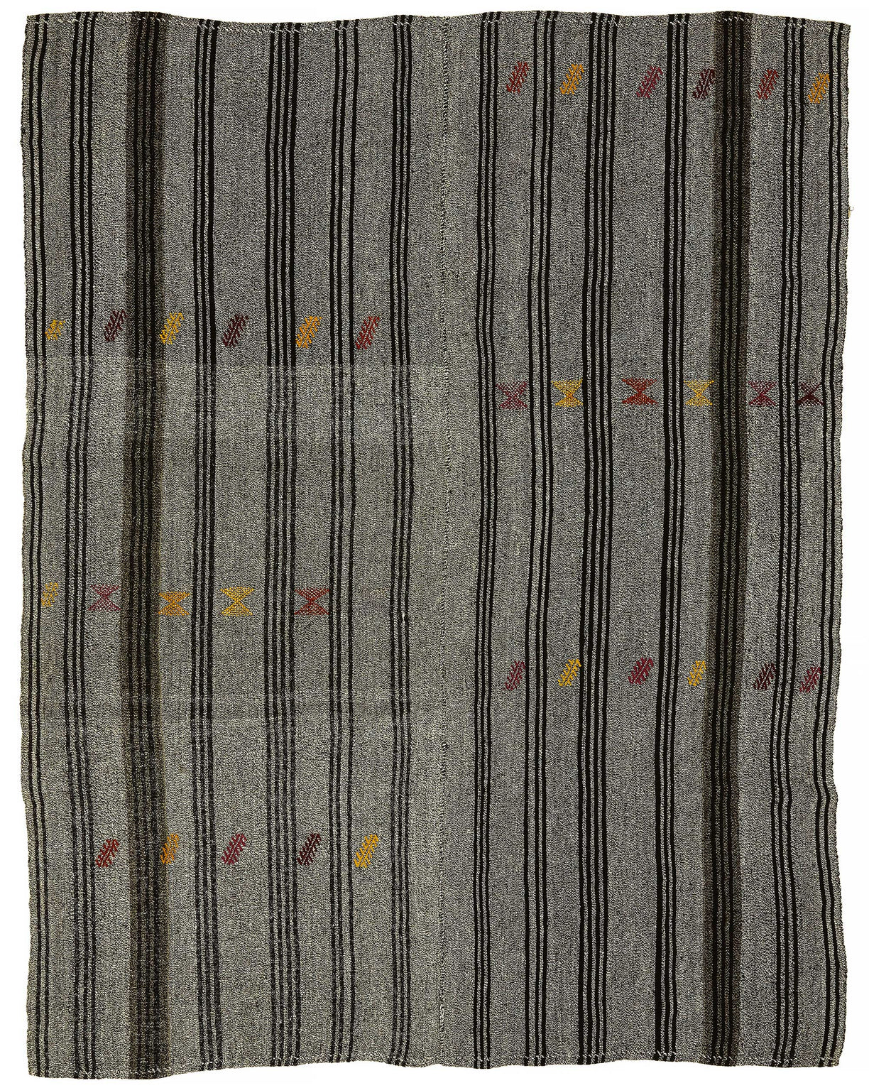 This handwoven kilim is crafted from a unique blend of goat hair and wool, a time-honored material combination used by Anatolian tribes for centuries. Known for its stiff, coarse texture, goat hair was traditionally used to make tents, saddle bags, and floor coverings due to its incredible durability and weather resistance.These vintage kilims, usually 40–60 years old, are perfect for high-traffic areas such as hallways, entryways, and office floors. The strong fiber structure allows the rug to lie flat and maintain its form over time.