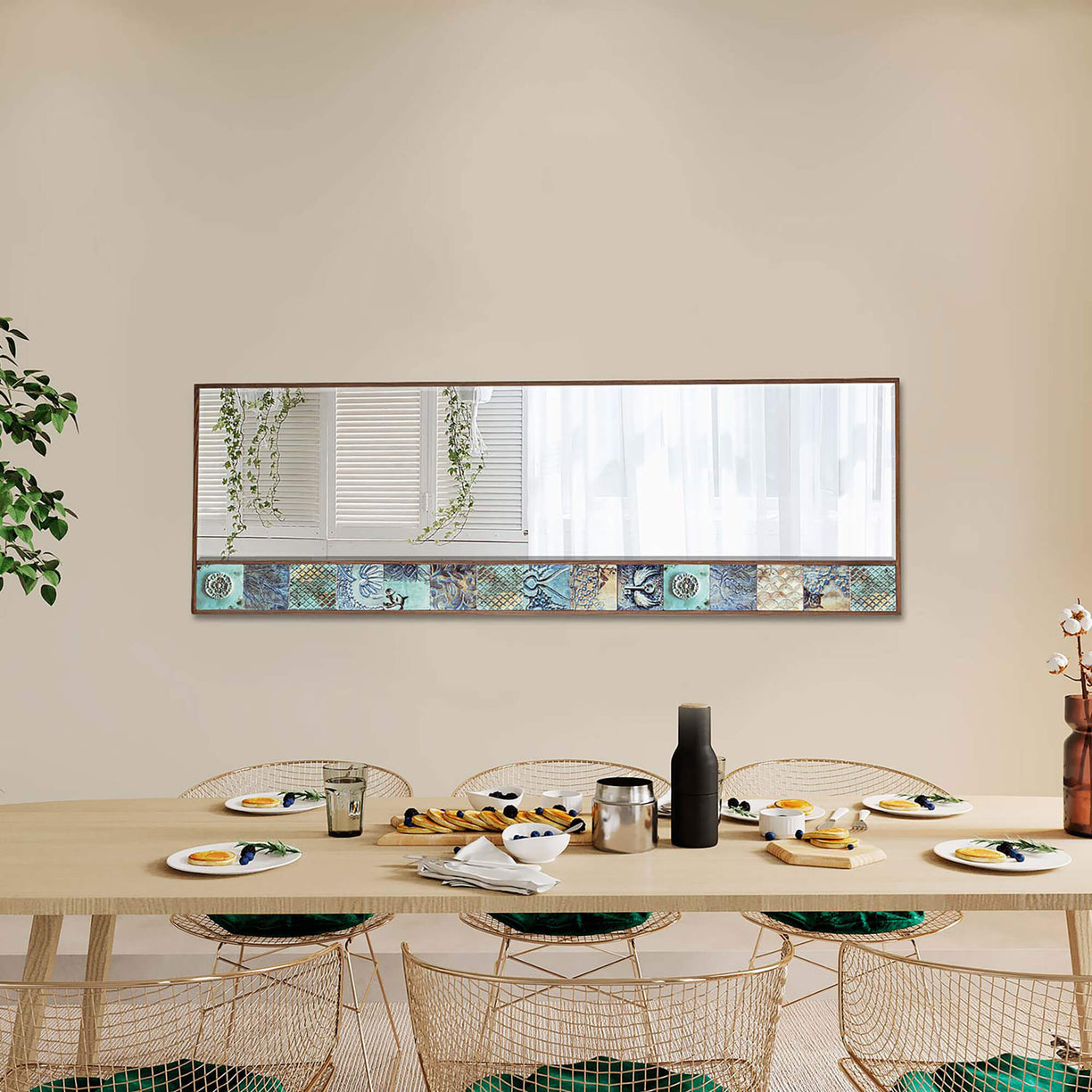 Wall hanging mirrors can enhance various areas within a home by adding light, depth, and style. Placing a mirror in entryways or foyers can create an inviting atmosphere, allowing people to check their appearance before entering or leaving the house. In the living room, hanging a mirror can visually expand the space, reflect light, and serve as an attractive decorative element, making the room feel brighter and more spacious. Similarly, in the dining room, mounting a mirror can add depth, create visual interest, and reflect ambient light, enhancing the dining experience and making the space feel more open. As for the bedroom, no specific information is provided. Wall hanging mirrors in bedrooms can serve both functional and decorative purposes. They allow for checking appearances and add style to the room's decor. Placing mirrors in hallways or corridors can make these spaces feel more open and less confined, especially in narrow or dark areas. Mirrors are essential in bathrooms for grooming purposes. Consider wall-mounted mirrors above sinks or vanity areas to aid daily routines. If you have a home gym or workout area, mirrors can help you monitor your form and technique. Mirrors can be used in home gyms or workout spaces to check form and posture while exercising. They create the illusion of a larger area and reflect light. When considering the placement of wall hanging mirrors, think about the room's layout, lighting, and how the mirror will complement the existing decor. Properly positioned mirrors can add functionality, create a sense of spaciousness, and enhance the overall aesthetics of different areas within a home.QUICK OVERVIEW